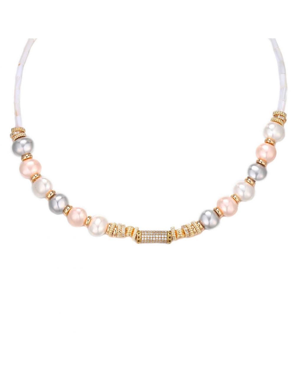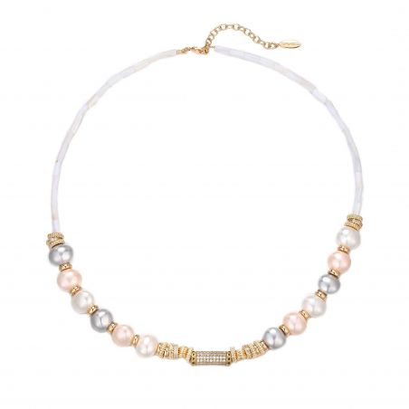 Collier ras-de-cou très raffiné, composé de douze perles de culture véritables et irrégulières (roses, grises et blanches), intercalées de rondelles dorées avec au centre un rythme de petites rondelles dorées, facettées, pavées de strass pour un look ultra précieux. On adore ce collier mode et précieux, monté sur des perles tubes en coquillage.