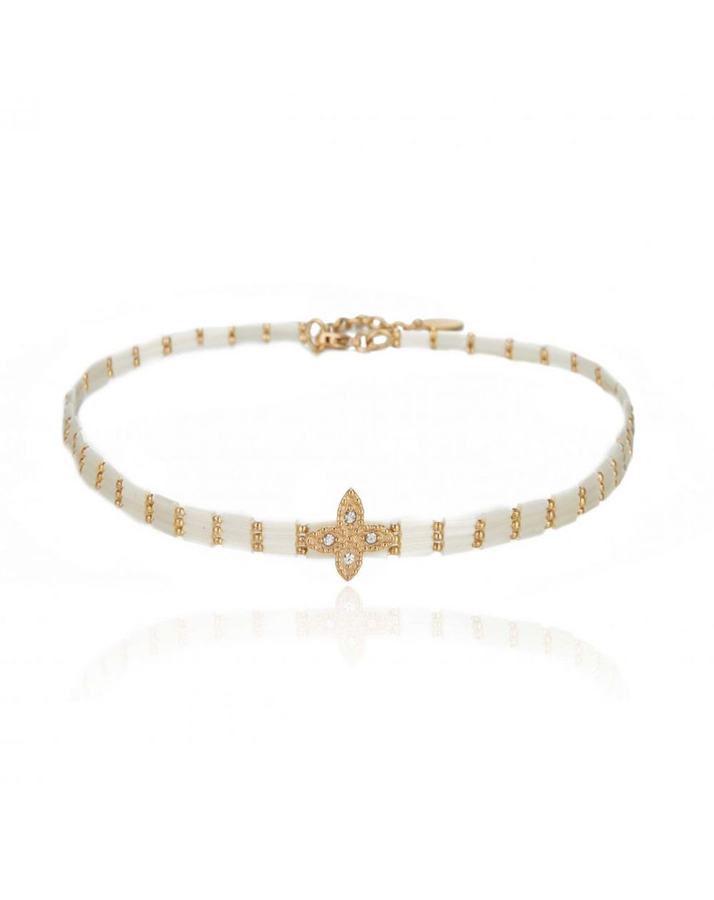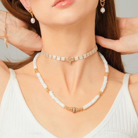 Collier ras-de-cou choker doré à l’or fin 14 carats, orné en son centre d’un trèfle à quatre feuilles un peu allongé, pavé de strass, ouvragé. Il est monté sur un bracelet de perles tubes nacrées effet coquillage, avec un rythme de petites perles boules dorées. À accumuler avec des sautoirs.