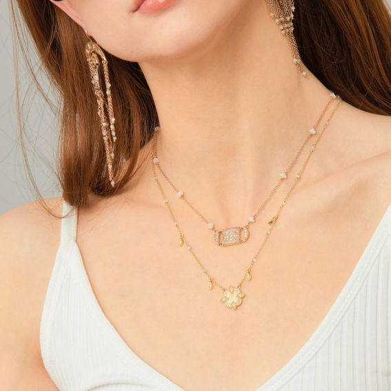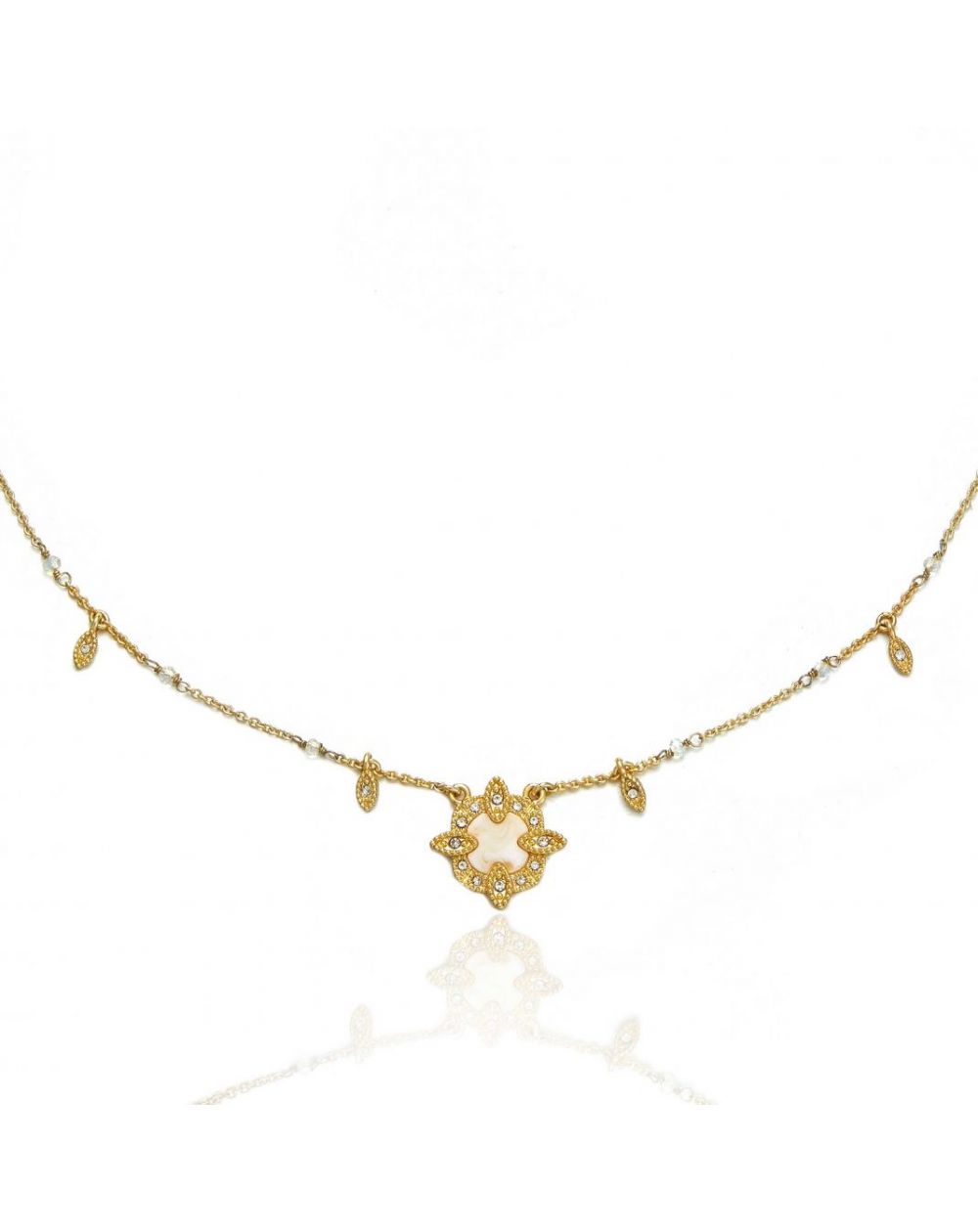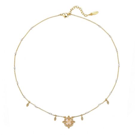 Collier ras-de-cou doré à l’or fin, monté sur une petite chaîne chapelet très délicate, avec un pendant cabochon ouvragé de petits strass effet diamant et orné d’une pierre centrale effet ivoire. De chaque côté, deux petites marquises en pampilles pour accentuer l’effet luxueux.
