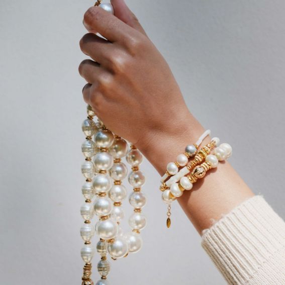 Bracelet en perles rondelles de coquillage nacrées, rythmé en son centre par une accumulation de petites rondelles dorées, striées et pavées de strass, que l’on retrouve intercalées sur l’ensemble du collier. Un bracelet précieux avec des perles véritables, à porter en accumulation pour l’été.