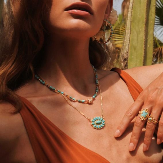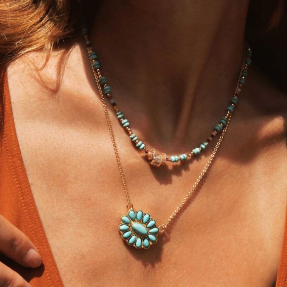 Le collier est réalisé avec une chaîne et un fermoir en laiton doré à l'or fin 14 carats d'une épaisseur de 0,075 microns, garantissant une qualité exceptionnelle et une durabilité remarquable. Les perles et les pierres semi-précieuses, notamment l'Hématite, le Grenat, le Quartz Rose, le Quartz teinté et la Turquoise, sont assemblées à la main avec une grande attention aux détails, conférant à chaque collier une touche artisanale unique.