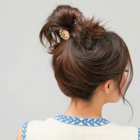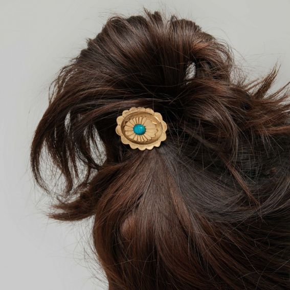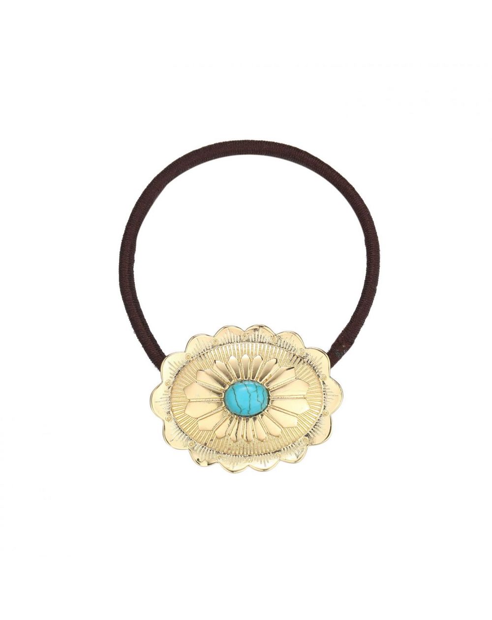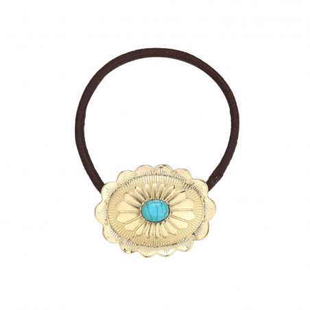 Elastique marron paré d’un cabochon doré oval très Navajo, orné d’un motif floral entouré de détails en croquet, paré en son centre d’une pierre bleue effet turquoise.