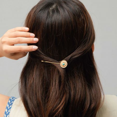 Barrette épingle plate dorée, ornée d’un cabochon martelé d’inspiration marguerite, avec en son centre une résine effet turquoise.