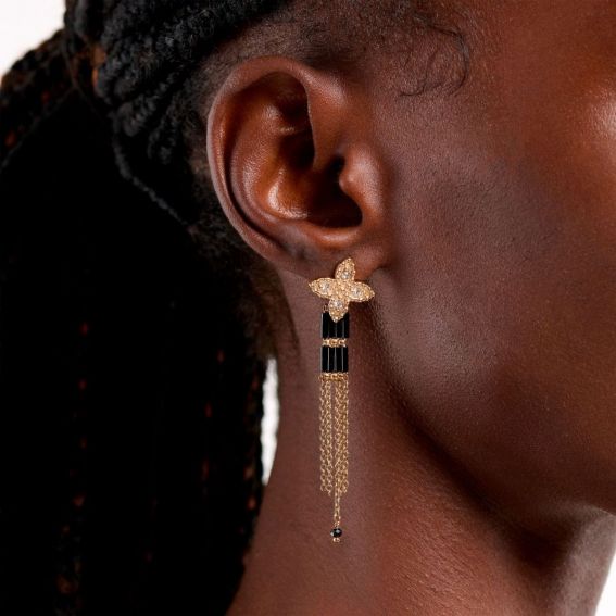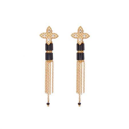 Ces boucles d'oreilles nous fascinent avec leur en-tête en forme de trèfle allongé, finement orné de strass, évoquant des reliques anciennes d'une cathédrale. Les chaînes délicates qui s'en échappent, ornées de perles tubulaires noires Miyuki et de perles dorées à l'or fin, ajoutent une touche à la fois féminine, puissante et raffinée. Leur longueur sublime gracieusement une nuque dégagée, apportant une élégance incomparable.
