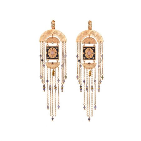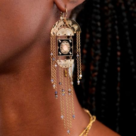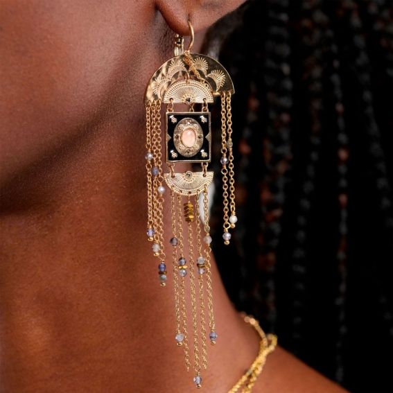 Resplendissantes et audacieusement ostentatoires, les boucles d'oreilles Clay sont un véritable totem de luxe à arborer avec une fierté joyeuse. Emblème central d'un thème qui traverse les âges en explorant avec espièglerie des trésors cachés, ces boucles en or fin symbolisent l'élégance intemporelle. Elles se distinguent par une somptueuse cascade de chaînes ornées de pierres semi-précieuses finement facettées. Entièrement réalisées à la main, elles mettent en avant un cartouche de résine à effet nacré, encadré par deux demi-cercles subtilement martelés, pour un design raffiné et unique.
