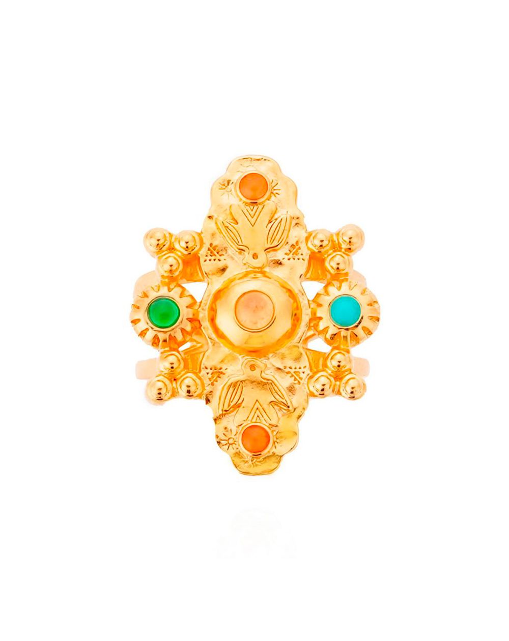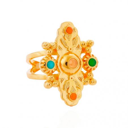 Sublimée par un double cerceau, cette bague dorée à l’or fin 14 carats incarne une élégance audacieuse. Imposante et raffinée, elle séduit par la précision de ses détails et l’énergie de son motif central, évoquant un totem sioux. Deux oiseaux-tonnerre majestueux encadrent un dôme imposant, tandis que des cabochons émaillés aux nuances profondes d’ocre, de rouille, de turquoise et de grenat viennent enrichir le tout. Ce bijou est une véritable ode à l’art amérindien, une pièce forte à porter avec fierté.