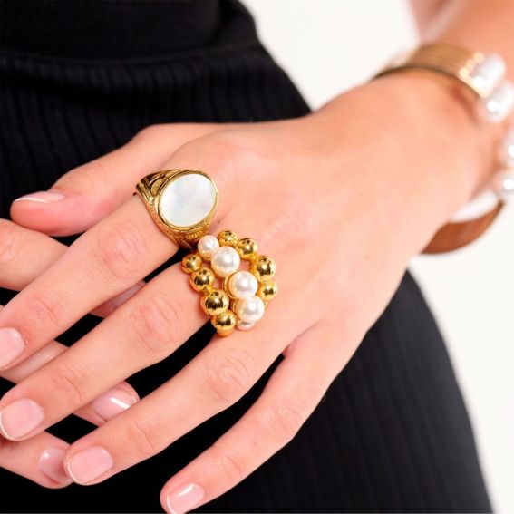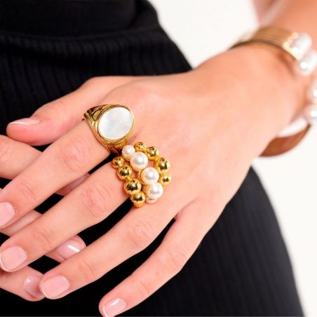 La bague Canopus s'inscrit parfaitement dans l'esprit audacieux et avant-gardiste de la collection Prestige, en détournant les codes du classicisme pour offrir une pièce qui joue avec les volumes et les matières. Son mélange subtil d'un look bling-bling maîtrisé avec trois rangs imposants de perles dorées et nacrées en fait une bague qui ne passe pas inaperçue. Le jeu sur les rondeurs et les volumes ajoute une dimension de luxe et de glamour à cette création, tout en maintenant une certaine élégance.