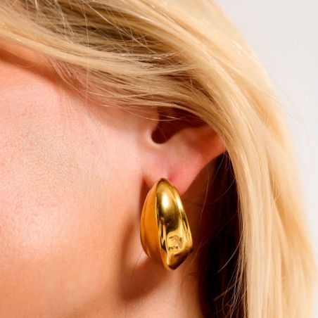 Ces créoles en forme de petit croissant de lune cossu incarnent à merveille l'audace et la modernité de la collection Prestige. Le mélange des textures et des matériaux, comme l'acier inoxydable doré à l'or fin 14 carats, souligne une esthétique contemporaine qui reste sophistiquée. Leur volume parfait les rend à la fois subtiles et affirmées, idéales pour ajouter une touche de glamour à un look quotidien ou de fête.