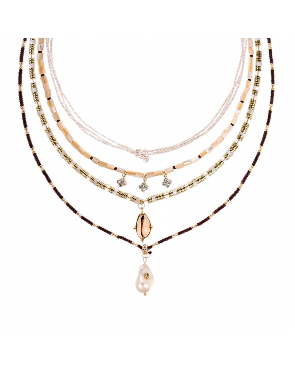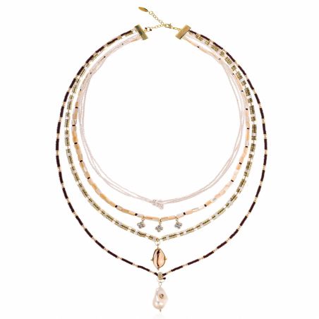 - Troisième lien : alternance harmonieuse de rondelles dorées et nacrées, mettant en lumière un pendentif cauri doré serti en point central.