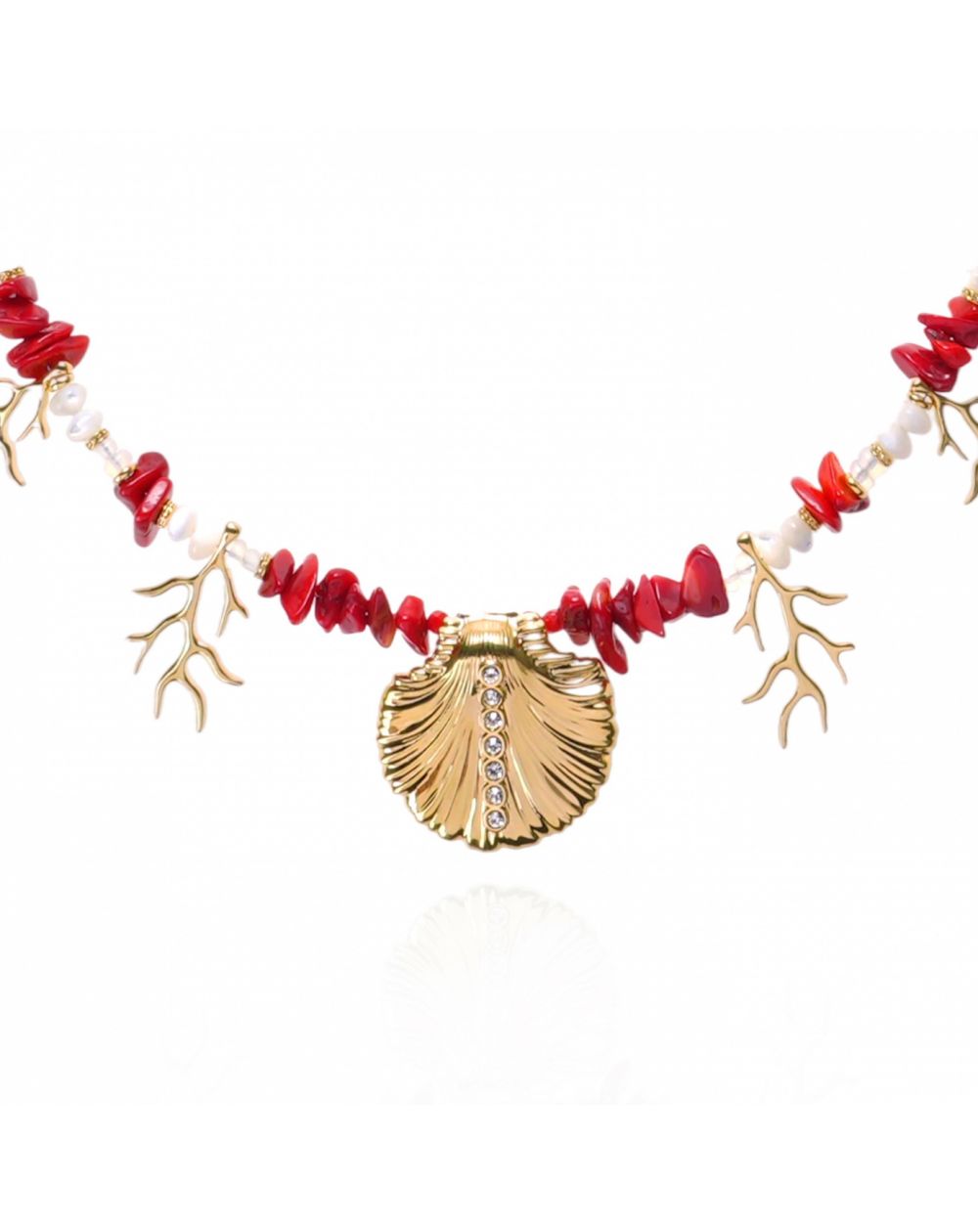 Sur toute sa longueur, le collier alterne pierres irrégulières rouge corail (bambou des mers), rondelles dorées et perles blanc nacré. Ce jeu de textures et de couleurs crée un rythme harmonieux, idéal pour sublimer un décolleté estival.