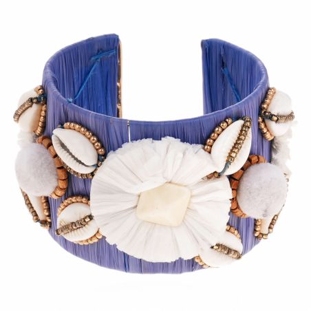 De charmants coquillages cauris viennent encadrer la composition, soulignés par des perles dorées qui évoquent la chaleur du soleil et l’esprit balnéaire. Ce subtil mélange de matières naturelles et de détails lumineux fait de cette manchette en raphia femme un accessoire fort et estival.