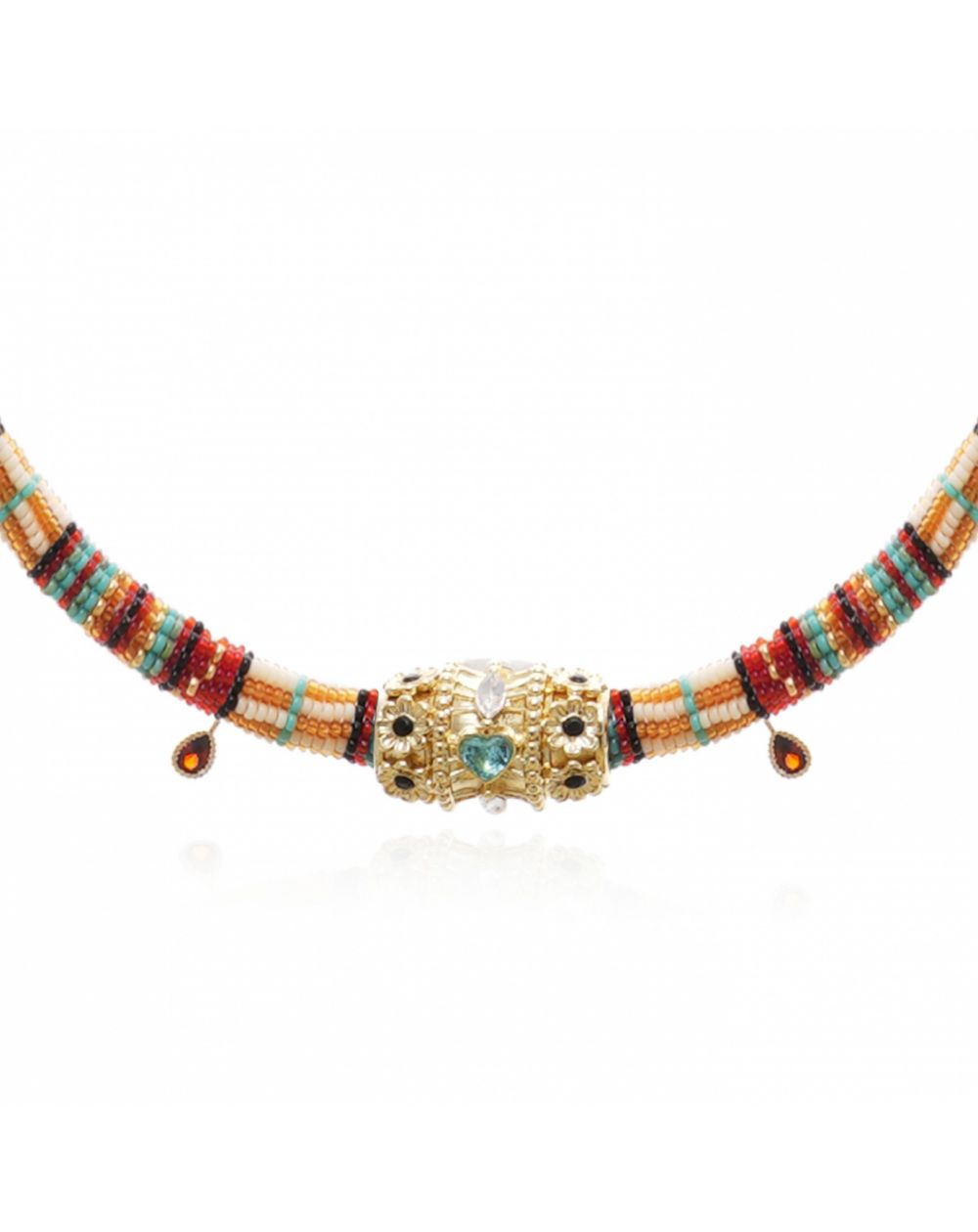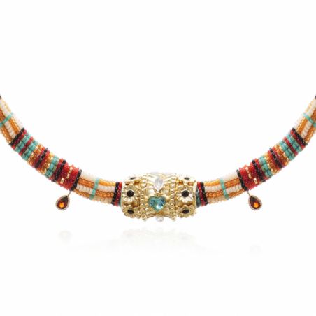 Son tissage de perles tubes colorées compose une base texturée et vibrante. Au centre, un pendentif doré à l’or fin 14 carats révèle un cœur bleu topaze lumineux, délicatement entouré de fleurs serties de strass effet diamant. Ce motif précieux apporte relief et éclat à l’ensemble.