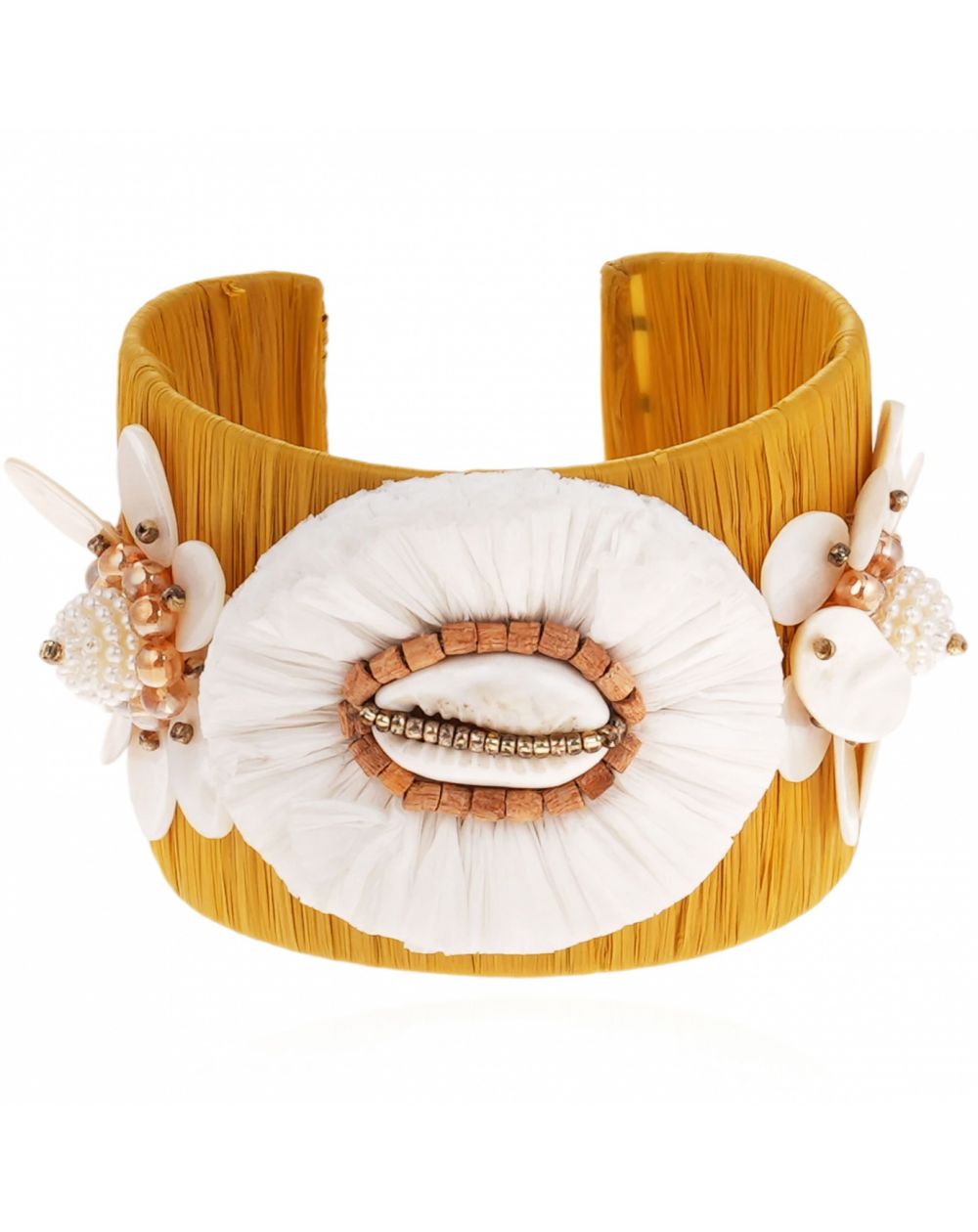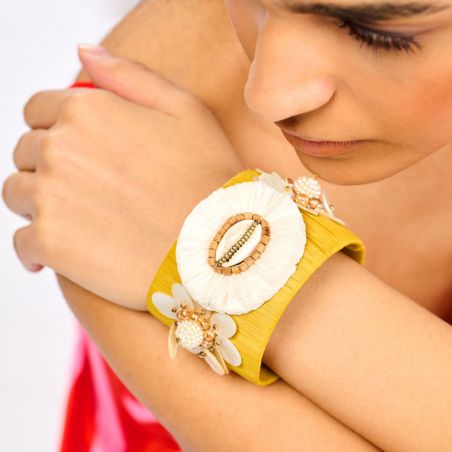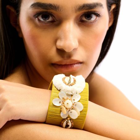 Le design est sublimé par de charmants coquillages cauris, encadrant la composition et rehaussés de perles dorées lumineuses évoquant la chaleur du soleil. Quelques sequins discrets viennent accentuer les reflets et donner du relief à cette manchette large en raphia femme.