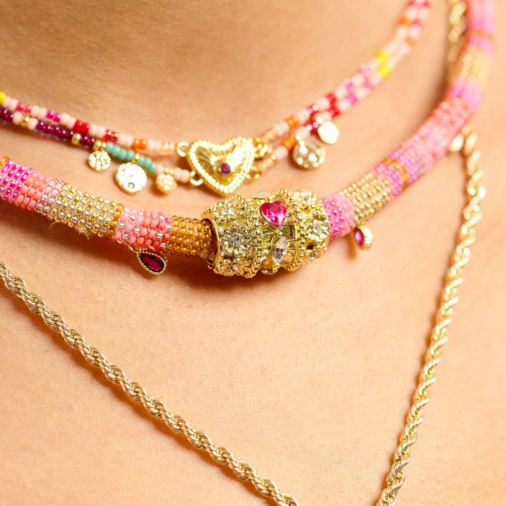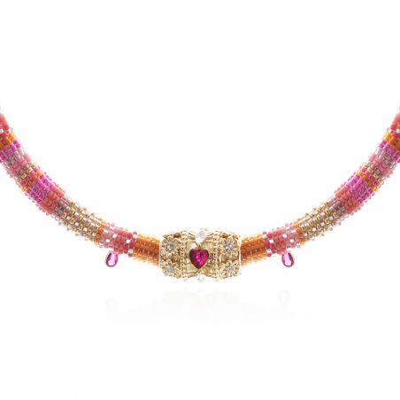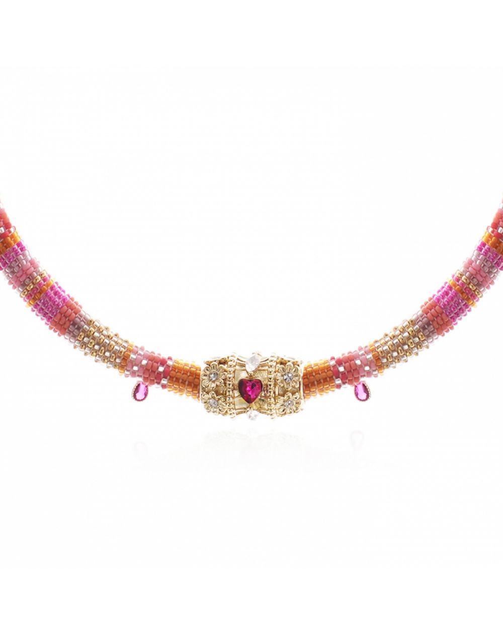 Son tissage de perles tubes colorées compose une base texturée et vibrante. En son centre, un pendentif doré à l’or fin 14 carats révèle un cœur rose effet tourmaline, délicatement entouré de fleurs serties de strass effet diamant. Ce motif central apporte éclat, relief et féminité.