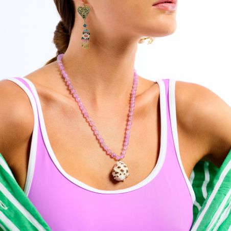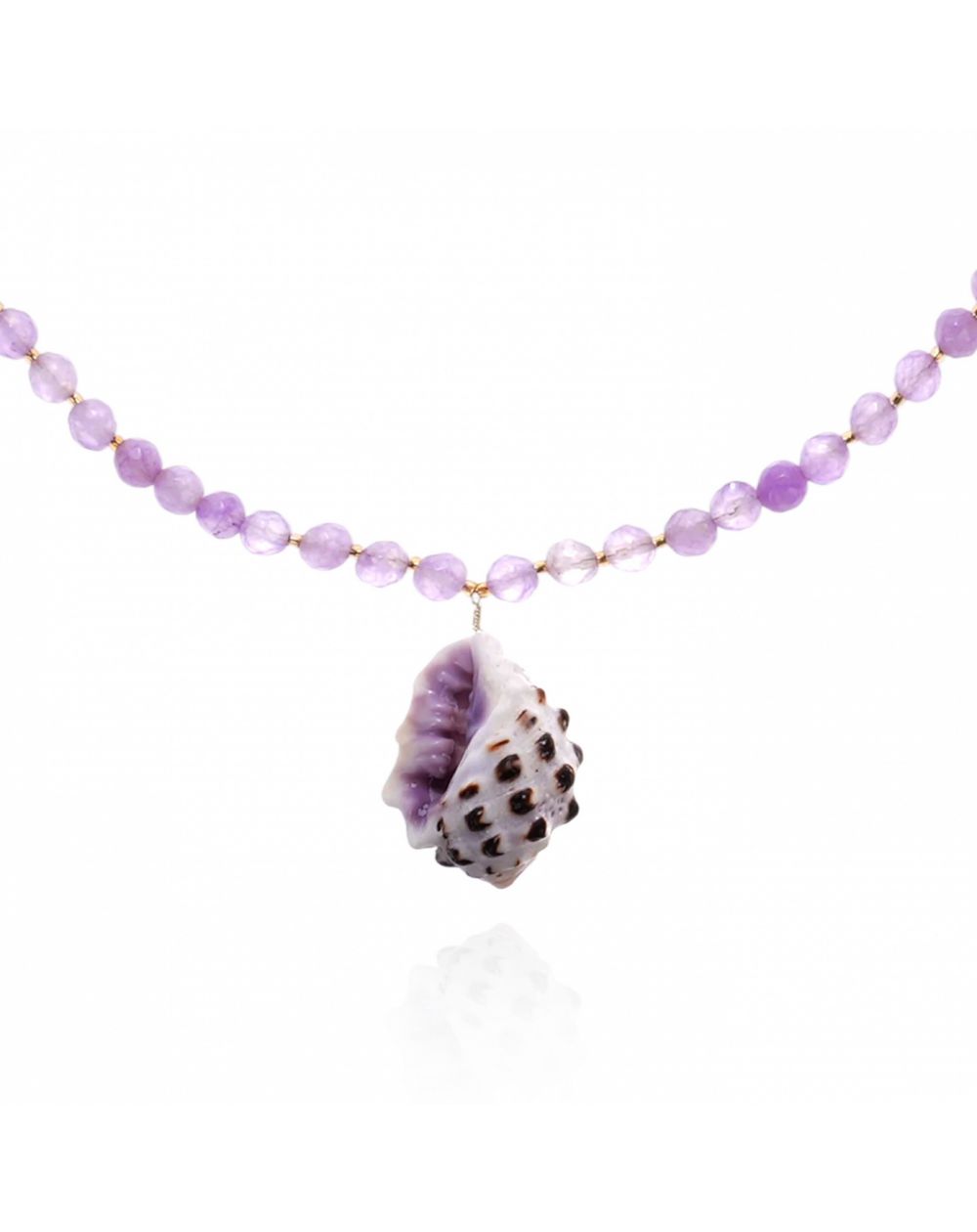 Composé d’un enfilage de perles violet améthyste, délicatement intercalées de rondelles dorées, ce collier long joue sur les contrastes entre profondeur minérale et éclat solaire. En son centre, un véritable coquillage naturel en forme de nautilus, subtilement tâcheté, apporte une touche authentique et précieuse.