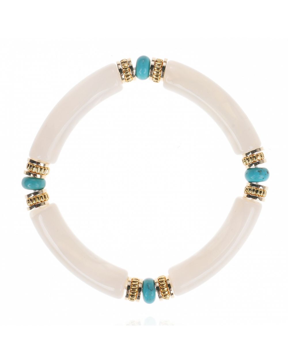 Dans sa version blanche, NOMADE révèle des perles moirées effet corne dans des nuances blanc lumineux et turquoise, apportant fraîcheur et élégance. Ce bracelet blanc élastique femme est idéal pour illuminer un look estival, accompagner un bronzage doré ou compléter une accumulation bohème chic.