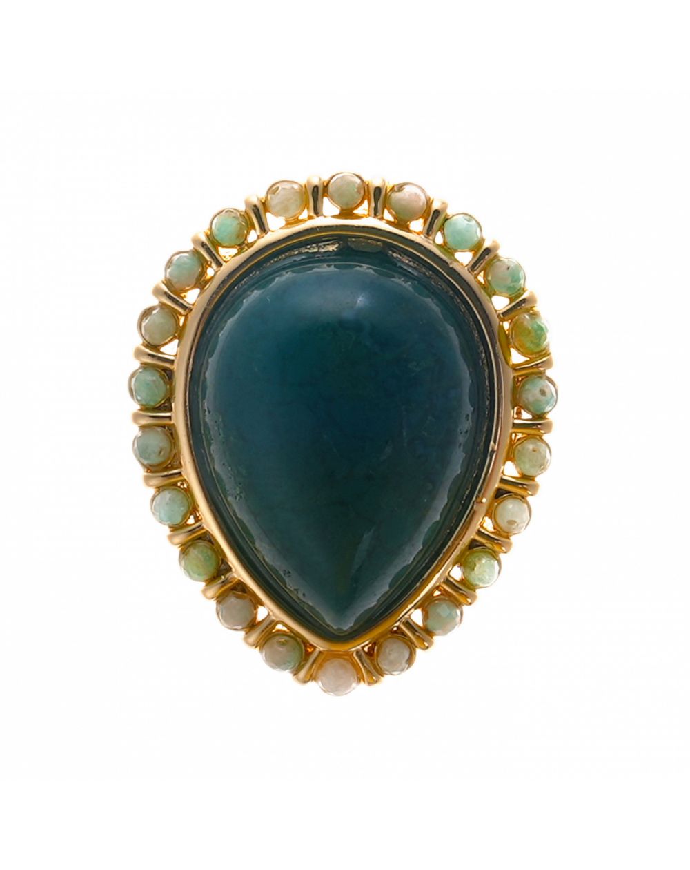 Au centre, une pierre en forme de goutte capte la lumière avec intensité. Dans cette version noire, elle révèle un vert profond et intense, subtilement mis en valeur par un entourage de perles aux nuances amazonite. Ce contraste délicat apporte relief et harmonie à l’ensemble.