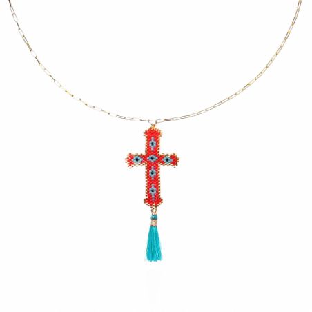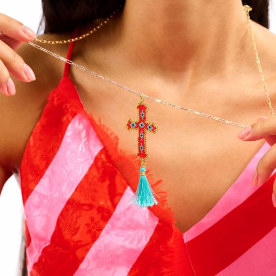 Au centre, une pampille généreuse et colorée représente une croix protectrice en perles de rocaille tissées, véritable symbole talisman. Dans cette version rouge, DIVYNA associe des perles dorées, rouges, turquoise et noires, créant un contraste vibrant et lumineux. L’ensemble se prolonge par un pompon turquoise, apportant mouvement et caractère.