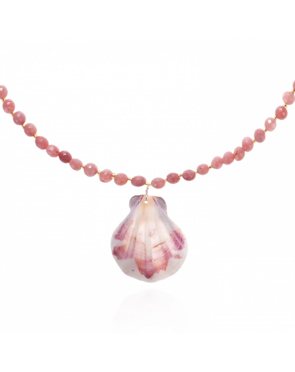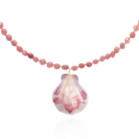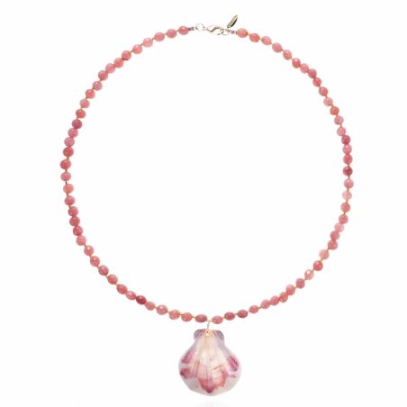 Composé de perles facettées rose poudré en quartz rose, délicatement ponctuées de perles dorées, ce collier long offre un éclat subtil et raffiné. En son centre se balance un véritable coquillage naturel de forme plate, apportant authenticité et caractère à l’ensemble.
