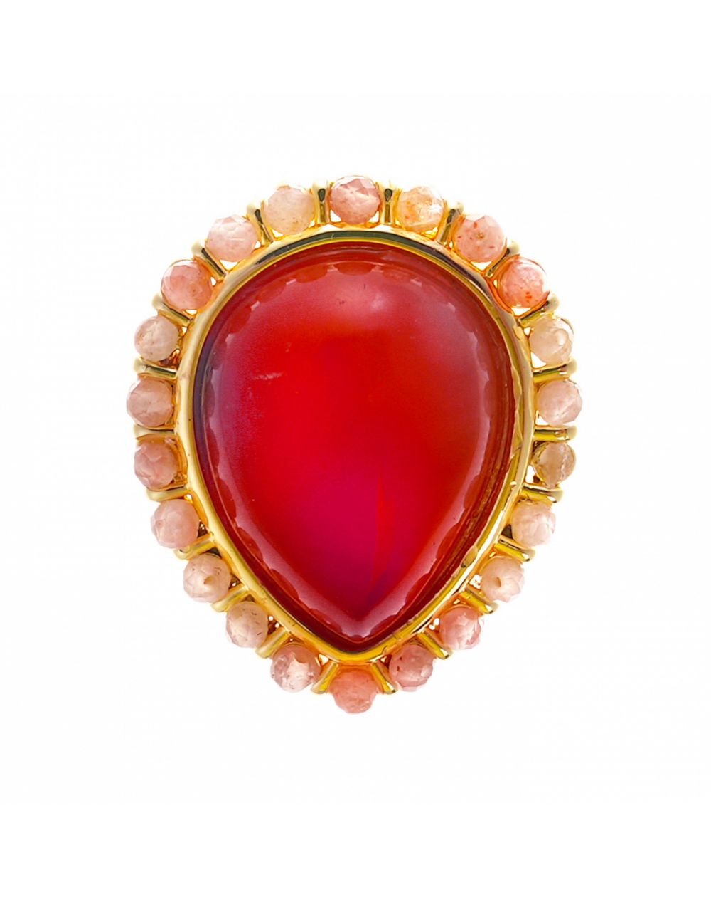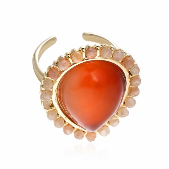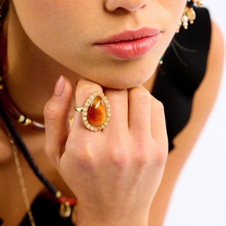 Au centre, une pierre en forme de goutte dévoile une teinte marbrée inspirée de la cornaline, aux nuances ambrées intenses. Elle est délicatement cerclée de perles facettées aux tons pêche clair, créant un contraste doux et harmonieux qui sublime le relief de la bague.