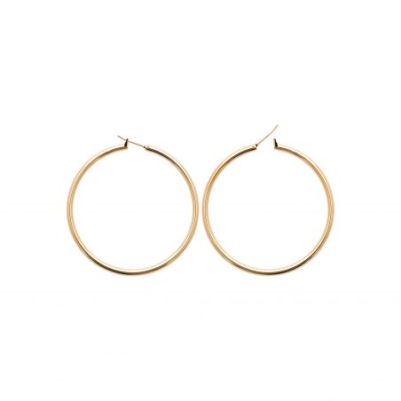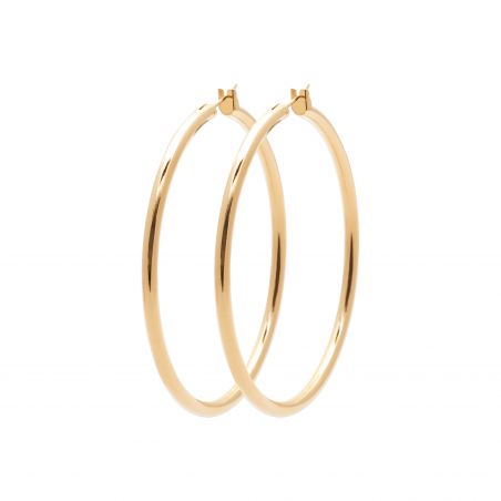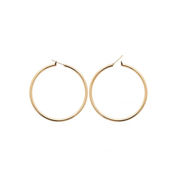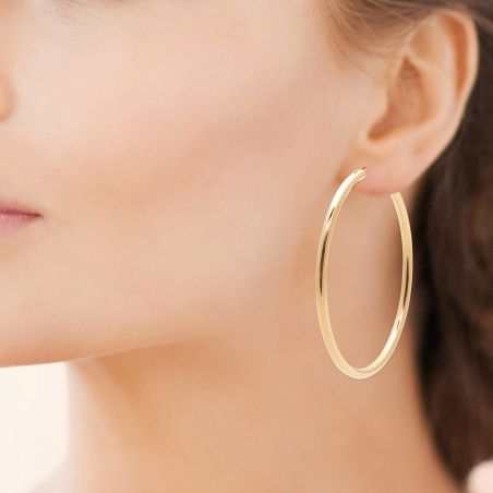 Ces boucles d'oreilles créoles en plaqué or 750 sont classiques et élégantes. Avec un diamètre de 60 mm, elles offrent une présence audacieuse tout en restant raffinées. Leur finition lisse et brillante les rend idéales pour compléter à la fois des tenues décontractées et des looks plus habillés, apportant une touche sophistiquée à votre style.