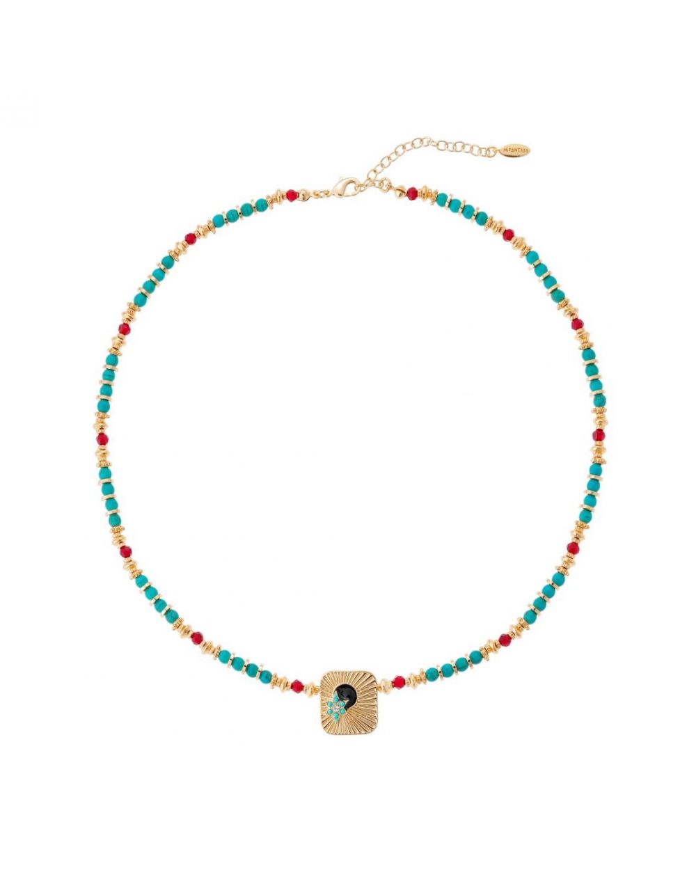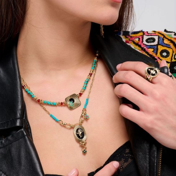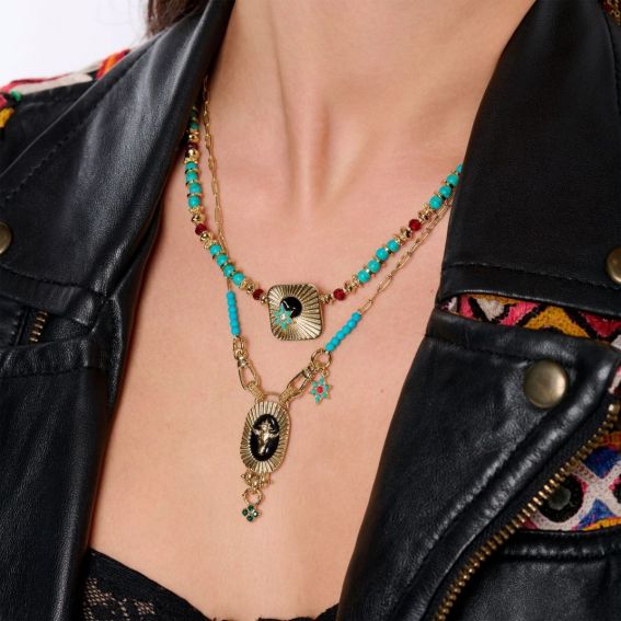 Laissez-vous envoûter par l'élégance de ce collier unique, où se marient harmonieusement les teintes turquoise, rubis et or. Doré à l'or fin 14 carats, ce bijou mêle avec raffinement des perles turquoises rondes, des perles facettées aux éclats rubis, et de délicates rondelles dorées, créant un jeu de textures audacieux qui rompt avec la symétrie traditionnelle. Le cabochon central, aux contours délicatement arrondis, est orné d'une étoile sertie de pierres turquoise et cristallines, tandis qu'une sphère noire émaillée, évoquant une nuit mystique, ajoute une touche de mystère à cette pièce magistrale. Un collier à porter sans modération pour sublimer vos tenues !