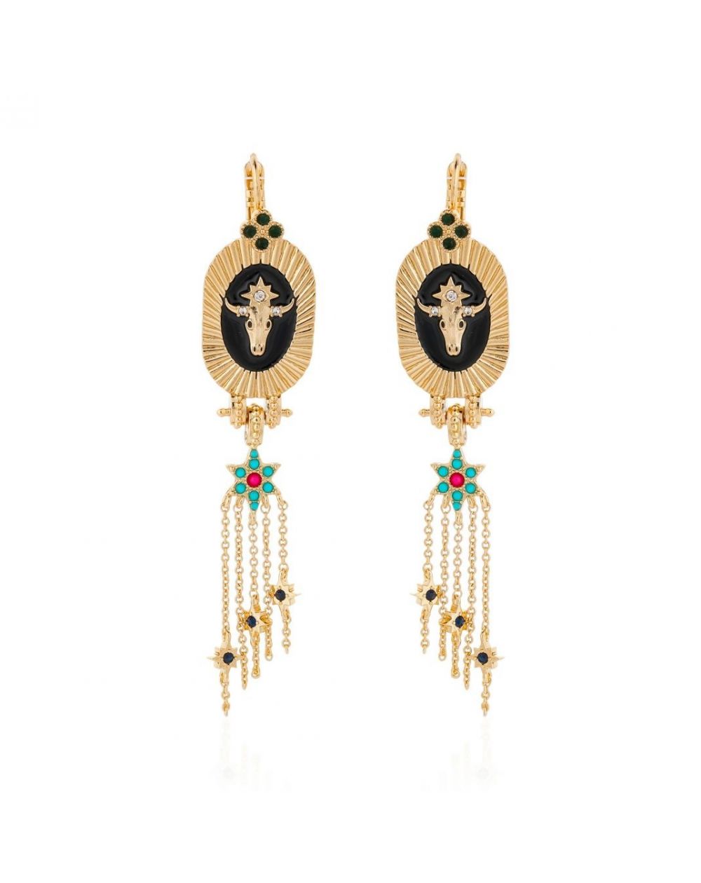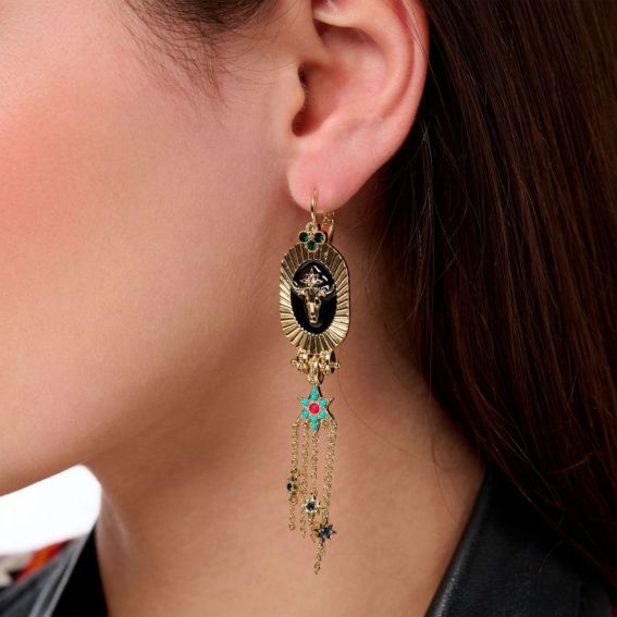 Cette boucle d'oreille est bien plus qu'un simple accessoire, c'est une véritable amulette, un talisman précieux aux vertus protectrices et bienfaisantes. Inspirée par un univers à la fois envoûtant et mystérieux, notre boucle d'oreille Altor, sublimée par une dorure à l'or fin 14 carats, se distingue par l'audacieuse alliance d'un cabochon ovale en émail noir, orné d'une tête de buffle dorée sertie de strass étincelants. Une cascade élégante de fines chaînes dorées, suspendue à une étoile pavée de strass aux reflets topaze et rubis, vient parfaire cette création. Sa longueur subtilement étudiée met en valeur une nuque dégagée, apportant une touche de chic irrésistible à votre allure.