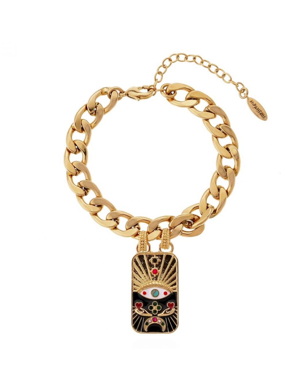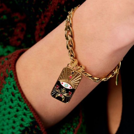 Cette pièce incarne parfaitement l'audace distinctive de HIPANEMA ! Fidèle à ce thème captivant, ce bracelet revisite avec élégance la chaîne gourmette XXL, à laquelle il associe un pendentif emblématique, véritable concentré de symboles incantatoires finement ciselés. On y retrouve l'œil protecteur serti d'une pierre turquoise, des cœurs envoûtants aux tons rouges rubis délicatement tenus par des mains bienveillantes, et un trèfle orné de strass vert émeraude. Le tout repose sur un fond bichromatique en émail noir et doré, traversé de rayons incandescents. Avec ce bracelet au volume remarquable, vous ferez sensation sans avoir besoin d'autre chose pour sublimer votre look !