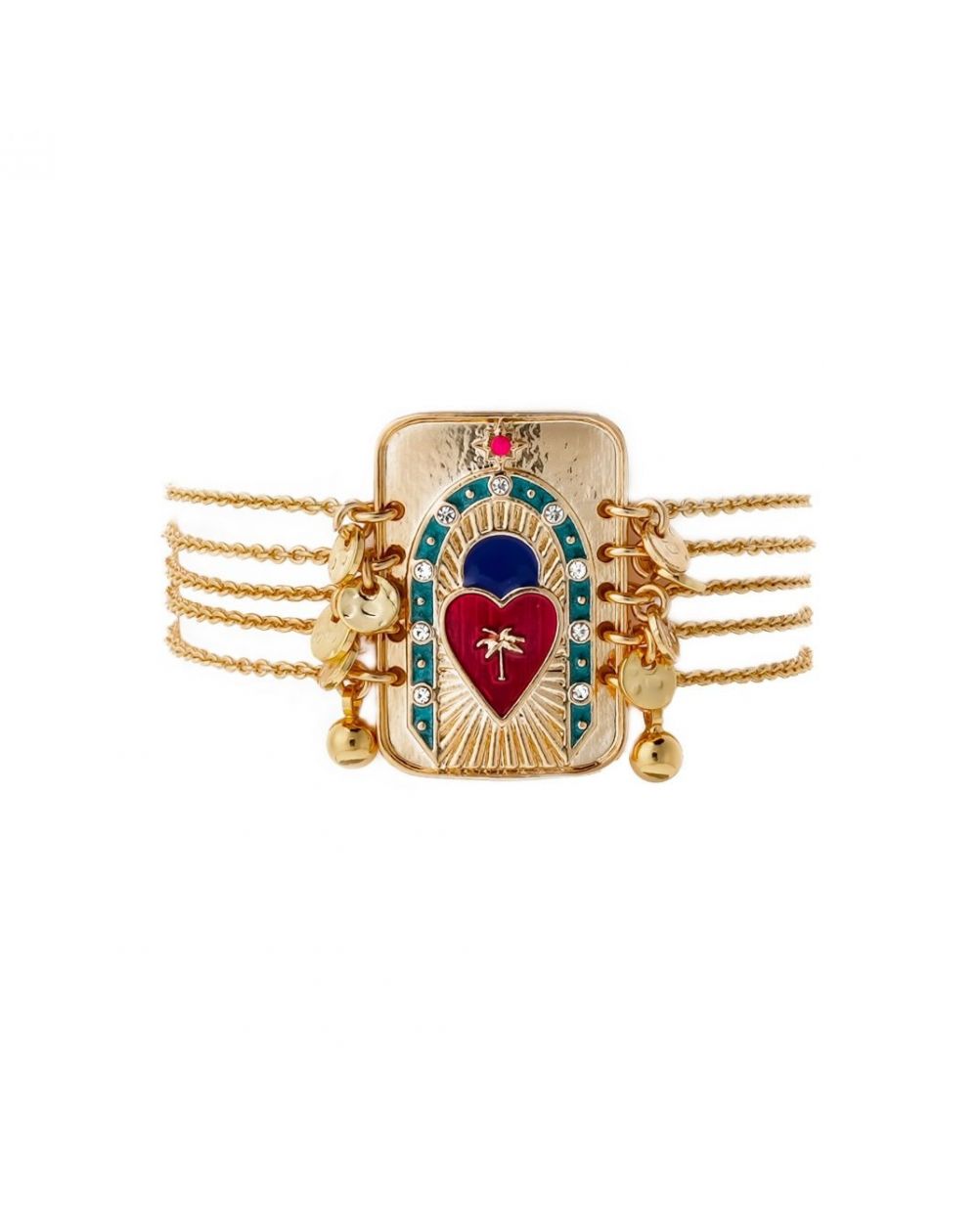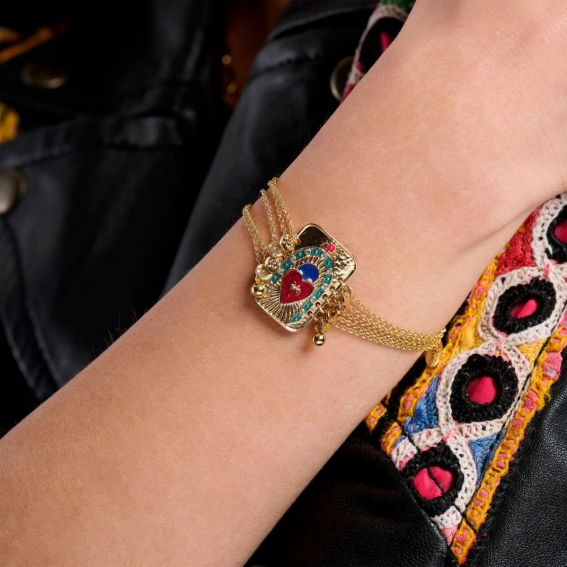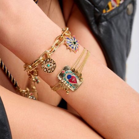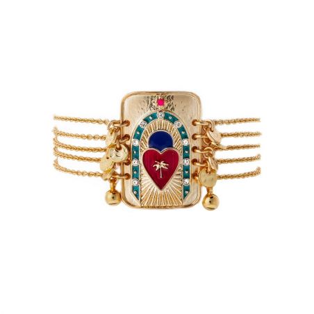 Laissez-vous envoûter par le mystère avec ce bracelet captivant, qui semble vous prédire un avenir audacieux et magique. Sa pièce centrale, évoquant une carte de tarot revisitée, est un véritable objet d'art. La ligne d'émail, minutieusement sertie de pavés de strass, encadre un cœur en émail fuchsia foncé sur lequel se dresse un palmier incrusté, le tout sur un fond de rayons enchanteurs et évocateurs. Ce bracelet incarne parfaitement la dualité séduisante de ce thème, alliant la délicatesse exquise de ses chaînes dorées à l'or fin à la force de caractère affirmée de son cabochon. Un bijou qui saura inspirer et sublimer votre style avec une touche de magie.