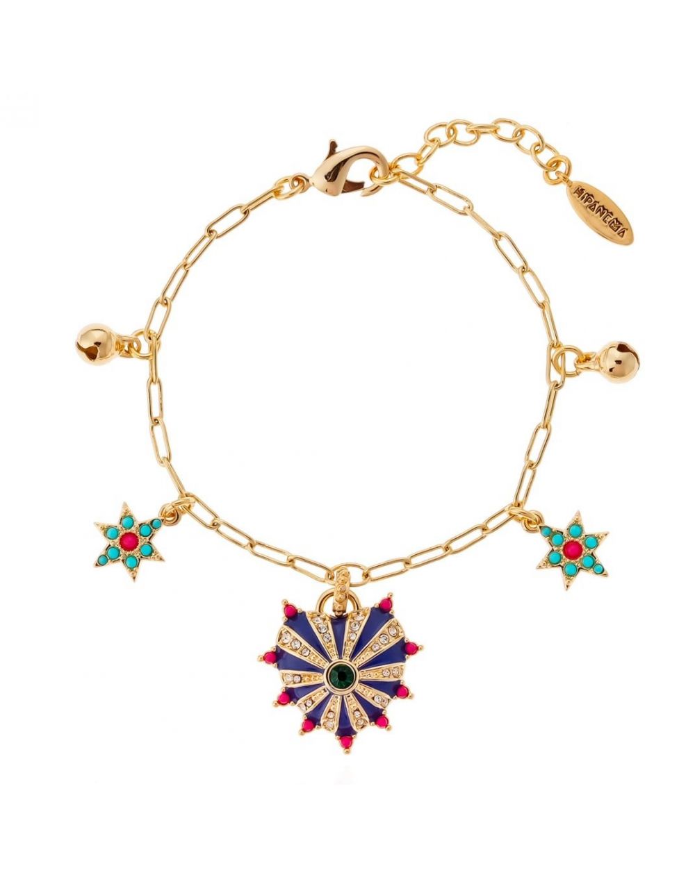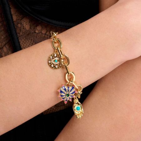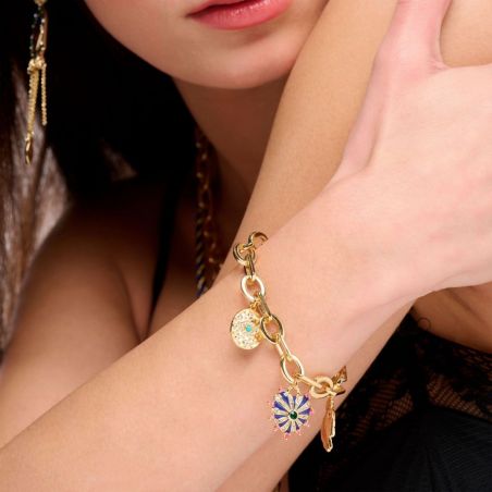 Ce bracelet en or fin 14 carats est un charmant talisman, conçu pour vous entourer de douceur et de bienveillance. Orné de breloques évoquant des gri-gris, il mêle élégance et symbolisme protecteur. Sa chaîne trombone au design graphique porte des étoiles scintillantes serties de strass, des grelots-amulettes tintinnabulants, et un cœur zébré d'émail pavé de strass minutieux, sublimé par une pierre vert émeraude envoûtante. Cette pièce précieuse est un bijou que l'on chérit infiniment, pour la protection et l'élégance intemporelle qu'elle apporte à votre poignet, ajoutant une touche de magie à chaque jour.