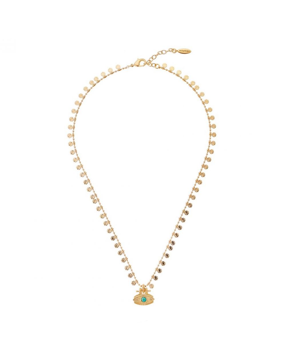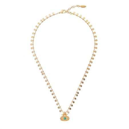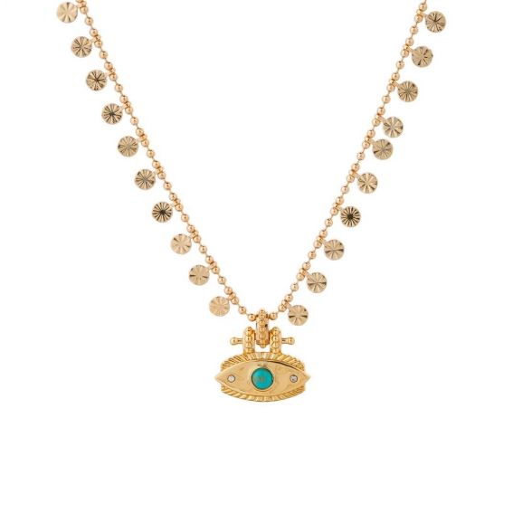 Ce collier captivant, véritable talisman, vous séduit par son œil protecteur et bienveillant. Doré à l'or fin 14 carats, il arbore une chaîne délicate ornée de petites pampilles striées et de fines perles dorées, disposées avec soin de part et d'autre de l'œil emblématique. La pierre turquoise en son centre, envoûtante et mystérieuse, diffuse une aura de magie protectrice. Ce ras du cou, à la fois adorable et précieux, est un bijou que l'on chérit sans fin pour l'élégance et la protection qu'il confère à notre style, sublimant ainsi chaque tenue avec une touche de mystère et de raffinement.