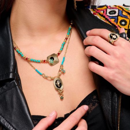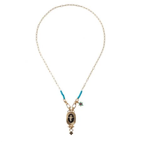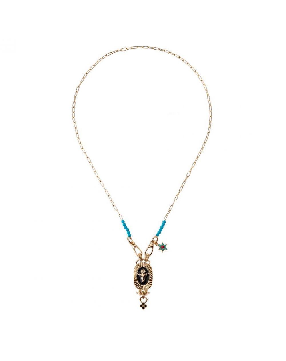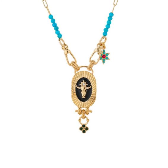 Ce collier envoûtant incarne à la perfection l'audace et l'ingéniosité, captivant par ses combinaisons uniques et ensorcelantes. Il se construit autour d'un cabochon émaillé de noir, sur lequel trône une tête de buffle dorée à l'or fin, minutieusement sertie de strass étincelants. Cette pièce magistrale se termine par un charm en forme de trèfle à quatre feuilles, symbole d'une prédiction d'un avenir magique. L'originalité de ce collier réside dans sa fermeture frontale, où deux crochets dorés, tels des mains protectrices, maintiennent le pendentif en place. La chaîne, dorée à l'or fin 14 carats, se distingue par des maillons trombone qui se prolongent audacieusement jusqu'à une séquence de perles rondes et turquoises, ajoutant une touche finale de mystère. Ce collier n'est pas seulement un bijou, mais une promesse d'une histoire captivante et pleine de mystères.
