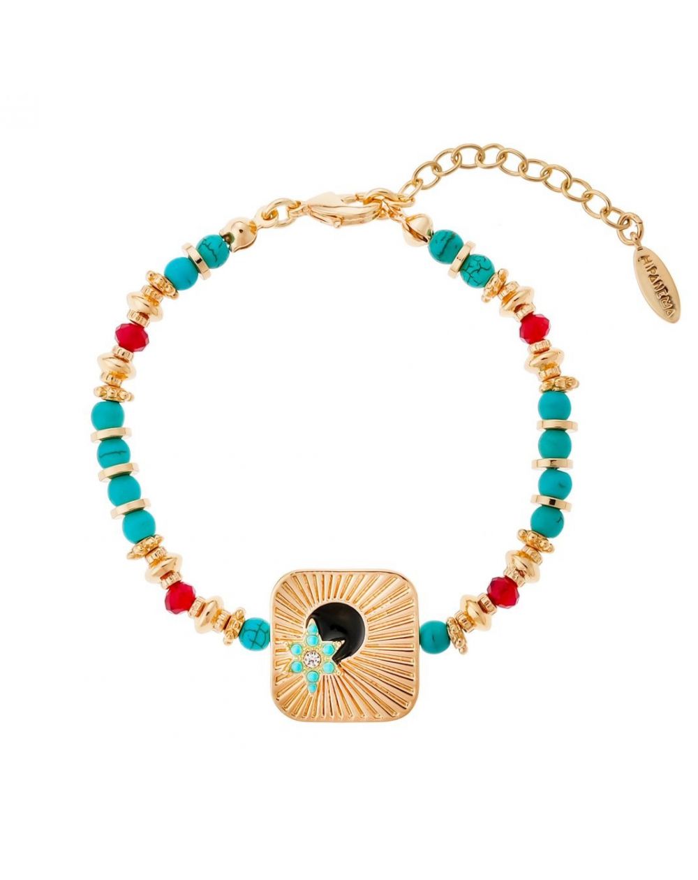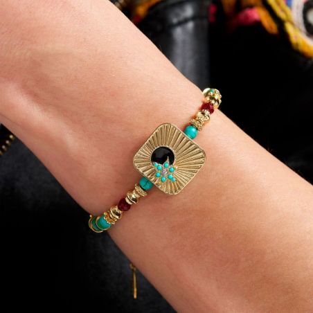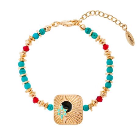 On succombe sans hésitation à ce bracelet qui allie avec finesse les teintes de turquoise, rubis, et or. Doré à l'or fin 14 carats, il se distingue par une alternance harmonieuse de perles turquoises rondes, de perles facettées aux éclats rubis, et de délicates rondelles dorées. Cette pièce sophistiquée défie les conventions en jouant avec audace sur l'asymétrie, rompant avec la monotonie. Au centre, un cabochon aux bords élégamment arrondis est serti d'une étoile ornée de pierres turquoise et cristallines, tandis qu'une sphère noire émaillée évoque la profondeur mystérieuse d'une nuit magique. Que vous le portiez seul ou en accumulation, ce bracelet est fait pour être arboré sans modération !