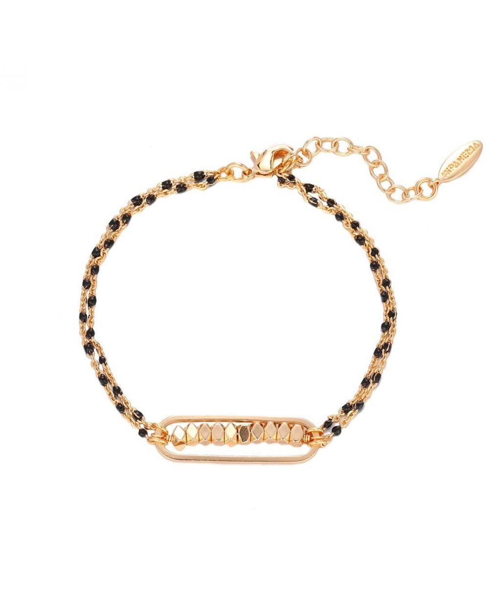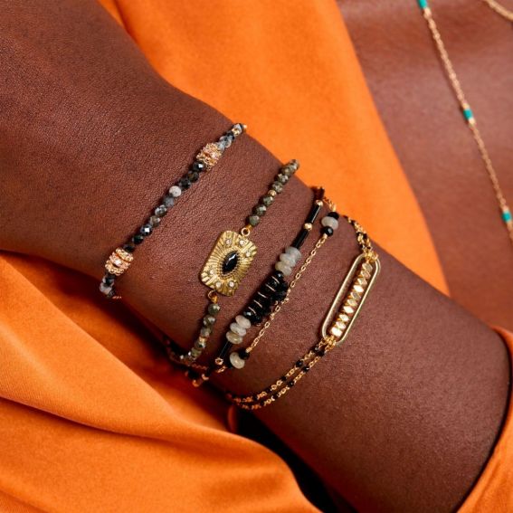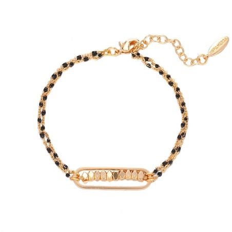 Ce ravissant bracelet, doré à l'or fin 14 carats, est subtilement rythmé par des perles d'hématite noires, entrelacées par une fine chaîne torsadée. En parfaite harmonie avec un thème aux nuances délicates et raffinées, il se distingue par une élégante série de perles dorées et facettées en son centre. Ce cadre soigné confère à cette pièce féminine un raffinement unique, sublimant avec grâce le poignet qui la porte.