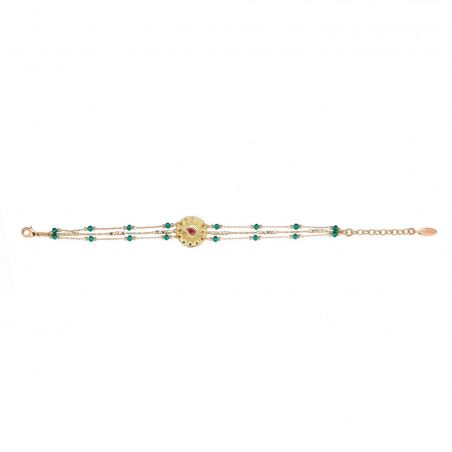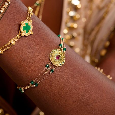 Ce bracelet à triple liens, doré à l'or fin 14 carats, est une véritable relique précieuse, exhumée des vestiges d'une civilisation autrefois luxuriante. Il nous invite à explorer la beauté envoûtante des mondes anciens. Les trois chaînes, délicatement ponctuées de petites perles vert émeraude, soutiennent une somptueuse médaille ornée d'une pierre à l'effet diamant aux reflets rubis, évoquant un œil protecteur. Avec son aura mystérieuse et bienveillante, ce bracelet incarne l'essence de l'élégance féminine, alliant raffinement et fascination, pour une pièce à la fois sophistiquée et envoûtante.