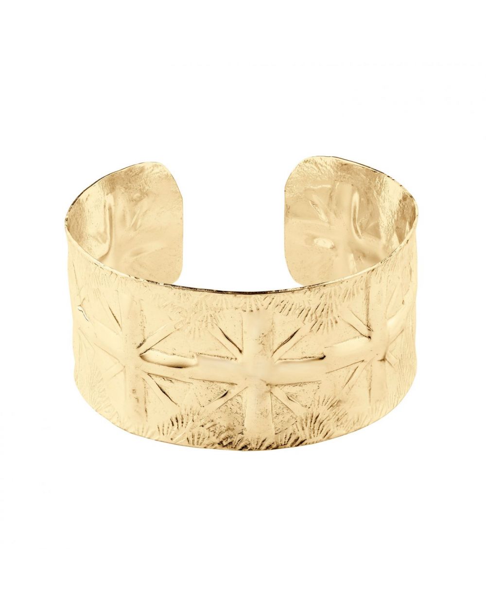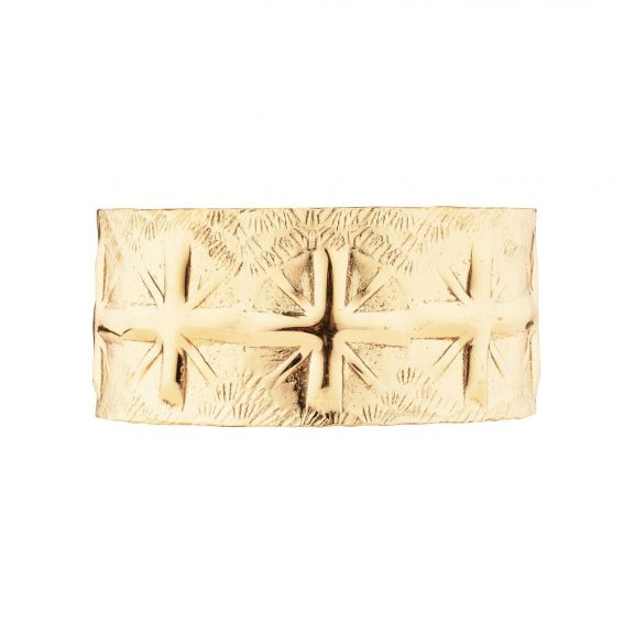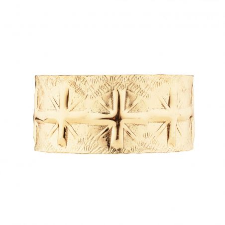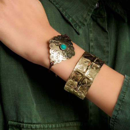 Découvrez la manchette Adsila, une pièce magnifiquement ouvragée aux motifs inspirés par la culture amérindienne. Cette manchette dorée à l'or fin, ajustable, évoque la puissance et la fierté des trésors de guerre. Chaque motif martelé avec précision autour du bracelet résonne comme un hommage à l'héritage Navajo.