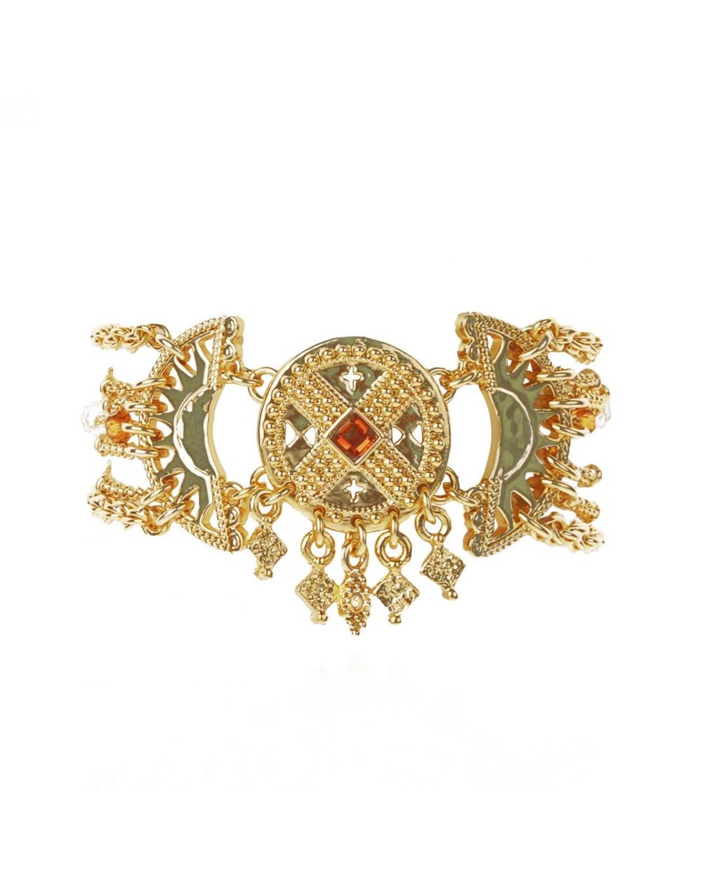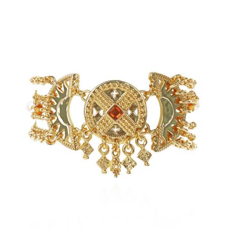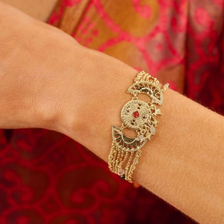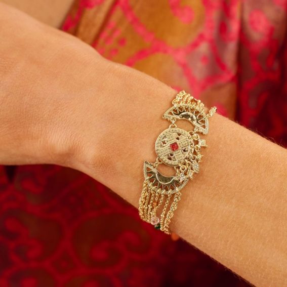 Le bracelet Murillo, inspiré de l’art inca, allie maîtrise technique et esthétique raffinée. Composé de sept chaînes dorées à l’or fin, il adopte l’allure d’une manchette et se distingue par deux demi-disques symétriques ornés d’un cabochon grenat en losange. De délicates pampilles ajoutent une touche porte-bonheur à cette pièce au charme intemporel.
