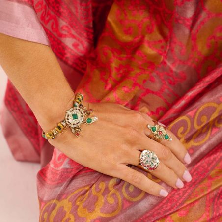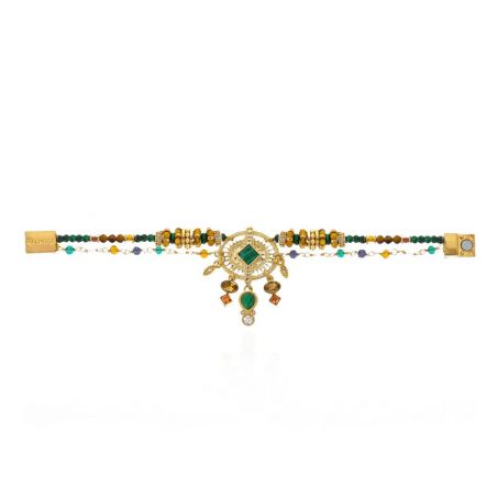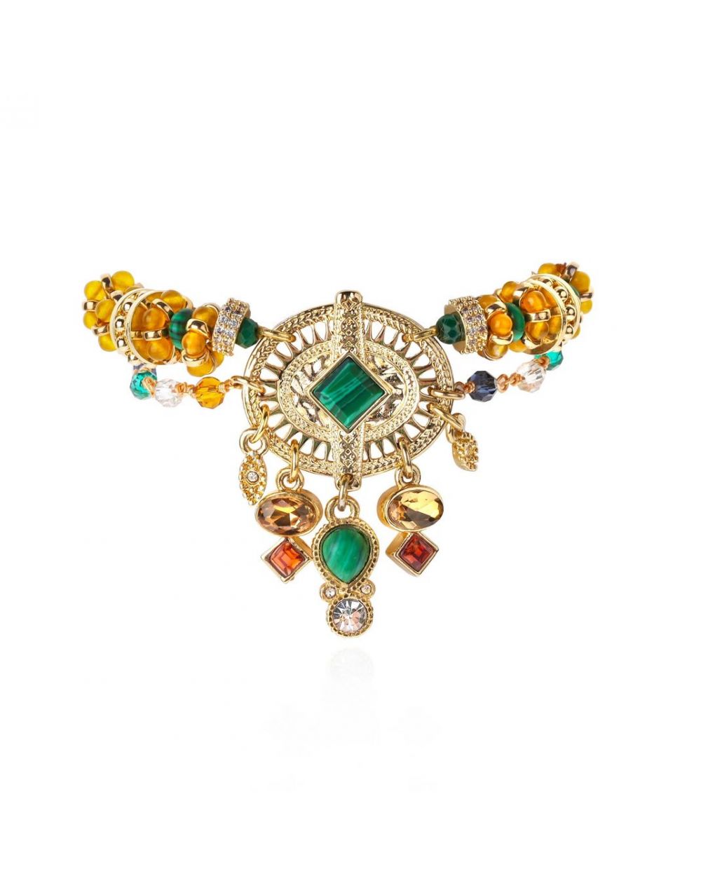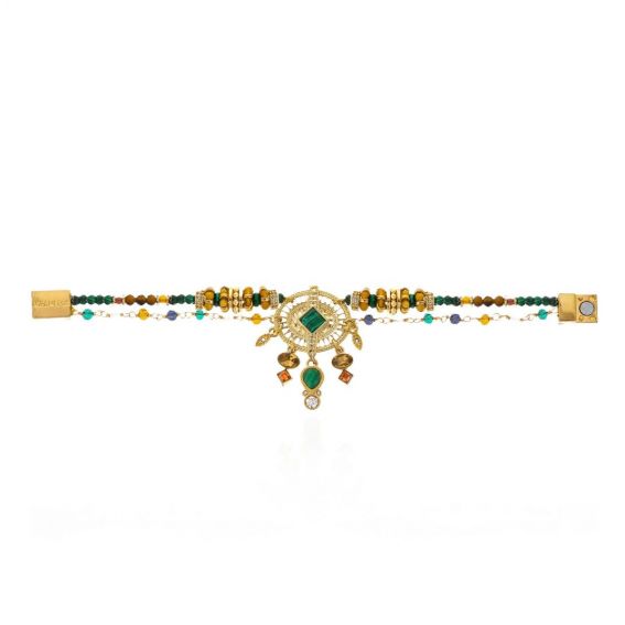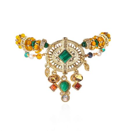 Mi-chemin entre l’art Maya et la mystique de la reine de Saba, la manchette Cités d’Or incarne une élégance solaire et puissante. Sa médaille centrale ajourée, ornée d’un cabochon malachite losangé, s’illumine d’une cascade de pampilles et de pierres vibrantes aux teintes turquoise et grenat. Trois chaînes perlées et martelées rythment l’ensemble, offrant un éclat fascinant.