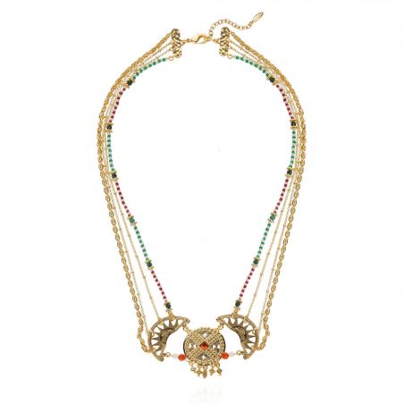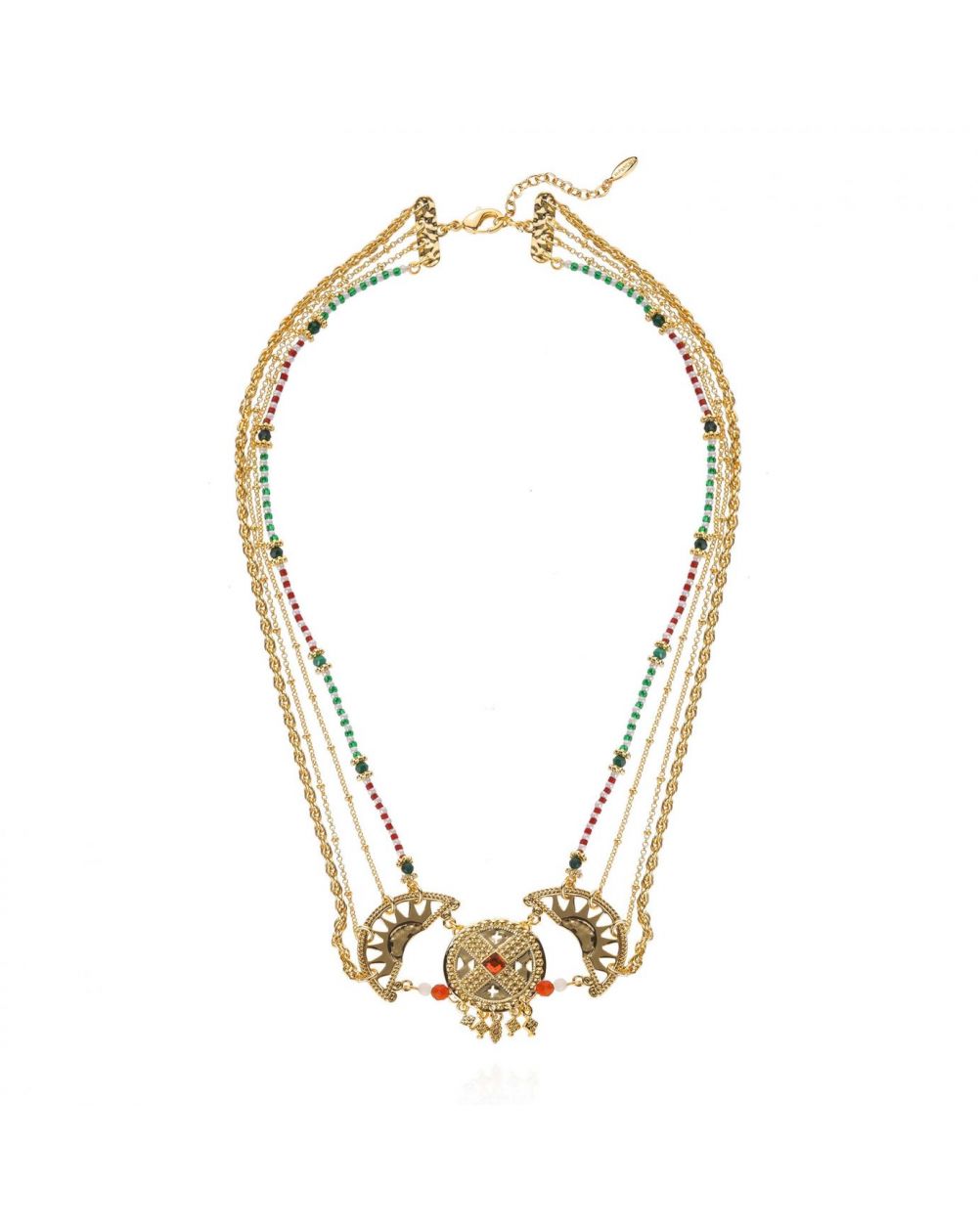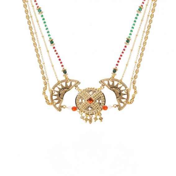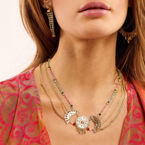 Le collier Maraja, inspiré de l’art inca, allie maîtrise technique et esthétique raffinée. Monté sur trois chaînes dorées à l’or fin et un lien perlé, il se distingue par deux demi-disques symétriques encadrant une pièce centrale ornée de lignes diagonales et d’un cabochon grenat losangé. Cinq pampilles délicates apportent une touche mystique et envoûtante à cette création emblématique.