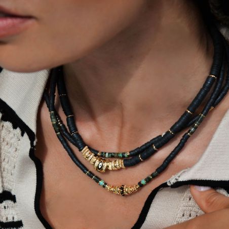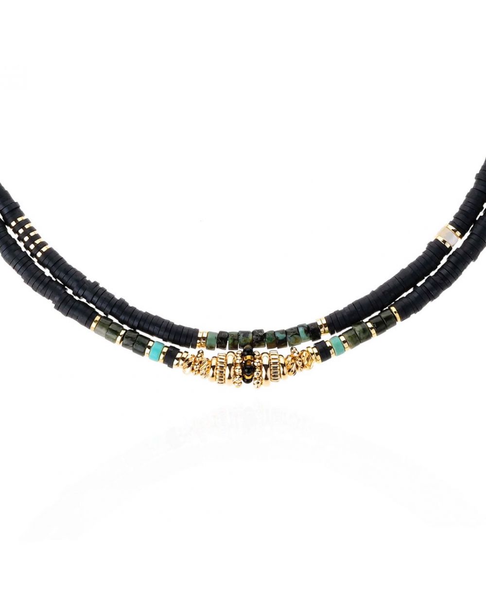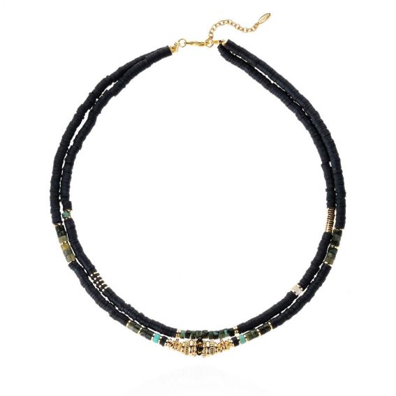 Le collier Twinsy Noir, inspiré des trésors colorés du Rajasthan, joue sur l’alternance de symétrie et de motifs aléatoires. Composé de deux liens dorés à l’or fin, il s’orne de perles en jade et en pyrite, rehaussées de rondelles et sequins dorés. Son premier lien met en valeur le décolleté avec un élégant assemblage de perles plates et pyramidales finement travaillées. Décliné en six couleurs, il s’adapte à toutes les envies.