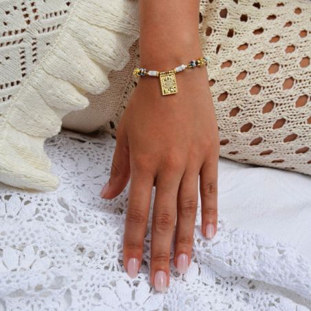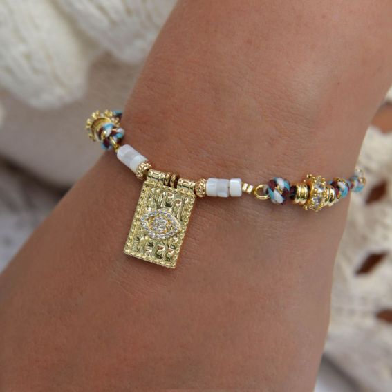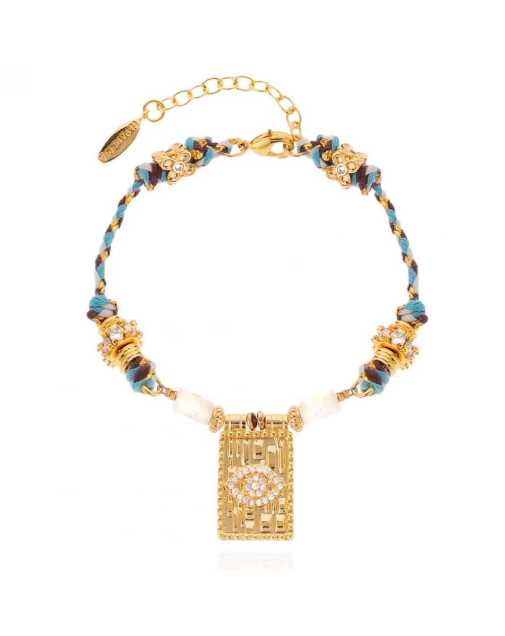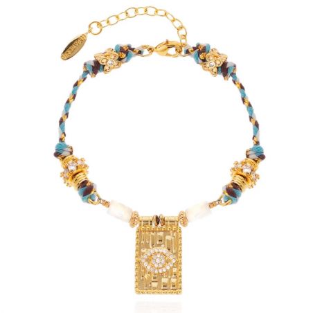 Le bracelet Gamaro, inspiré des trésors du Rajasthan, joue avec contrastes et volumes pour un effet précieux et raffiné. Il associe la finesse des cordons pincés et des plaques dorées à la richesse des pierres semi-précieuses, jade et jaspe, ainsi qu'à des barillets incrustés de strass. Son pendentif martelé, orné de l’emblématique œil protecteur en strass, ajoute une touche ésotérique à cette pièce envoûtante. Disponible en vert et blanc.