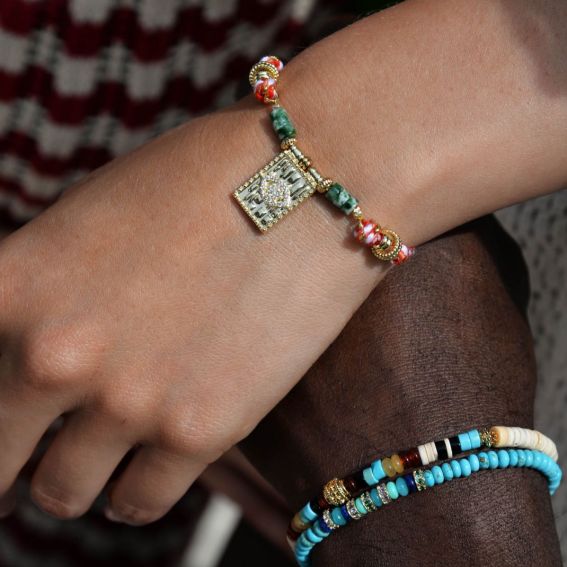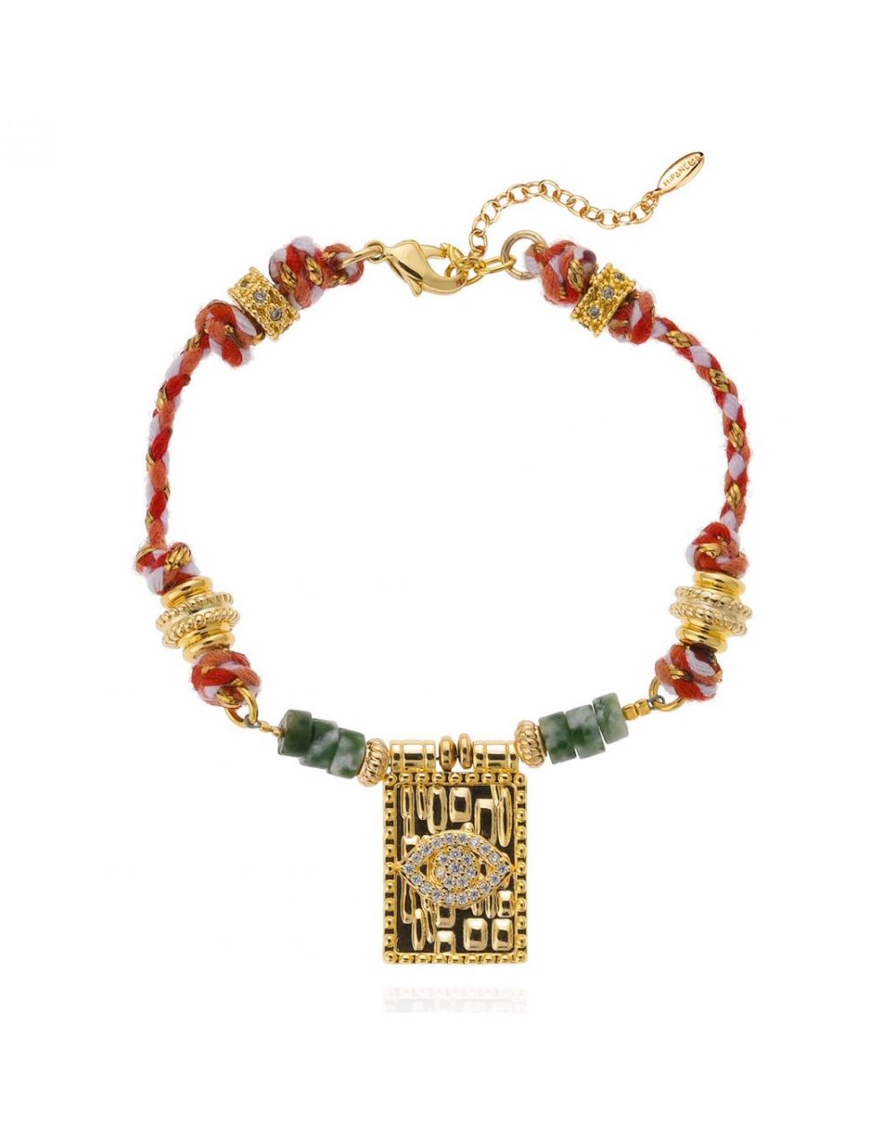 Le bracelet Gamaro, inspiré des trésors du Rajasthan, joue avec contrastes et volumes pour un effet précieux et raffiné. Il associe la finesse des cordons pincés et des plaques dorées à la richesse des pierres semi-précieuses, jade et jaspe, ainsi qu'à des barillets incrustés de strass. Son pendentif martelé, orné de l’emblématique œil protecteur en strass, ajoute une touche ésotérique à cette pièce envoûtante. Disponible en vert et blanc.