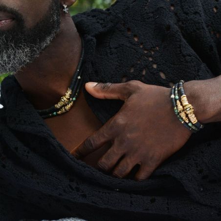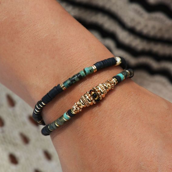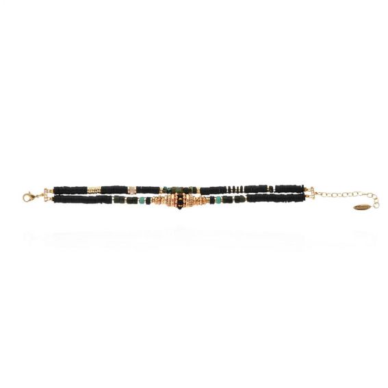 Le bracelet Kalie, inspiré de l’art Maya, séduit par ses couleurs vibrantes et son esprit bohème. Perles de verre cristallines, cabochon malachite et cordons tressés en ambre, vert et doré s’entrelacent autour du poignet. Ses mini pompons ajustables apportent une touche ludique et un confort sur mesure. Parfait pour illuminer l’été !
