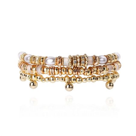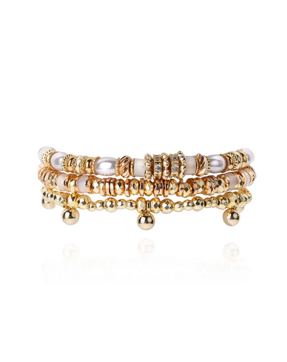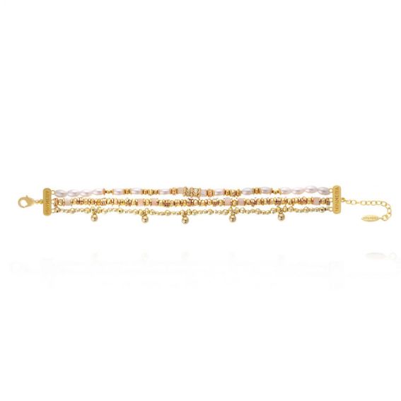 Le bracelet Vadorada Or, hommage aux trésors du Rajasthan, allie éclat et raffinement. Composé de trois rangées de perles de coquillage blanc nacré, il est sublimé par des rondelles et perles plates dorées à l’or fin. Parfaitement assorti au collier Trion, il se mixe élégamment avec ses sept autres déclinaisons pour une accumulation lumineuse et sophistiquée.