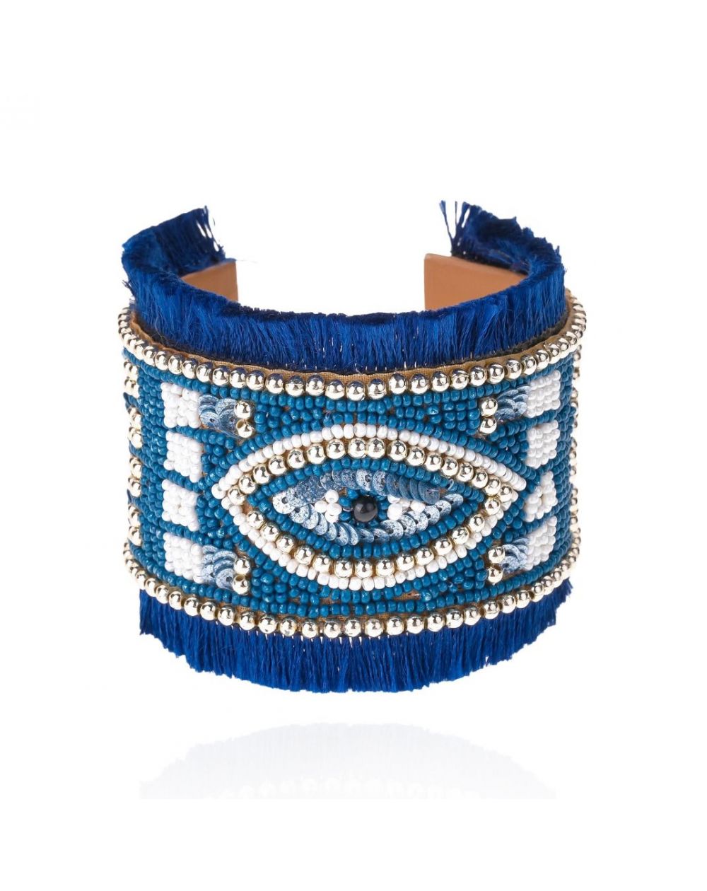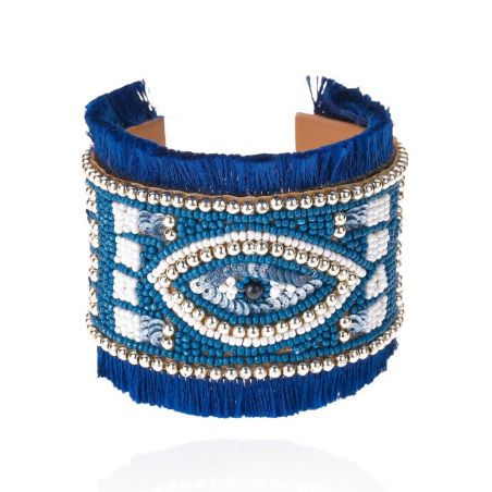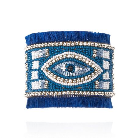 Inspiré des rivages grecs, le bracelet Bill capture l’élégance solaire de Coral Coast. Brodé de motifs géométriques en perles de rocaille blanches, bleues et dorées, il s’illumine en son centre d’un œil protecteur fascinant. Ses lignes de perles et de sequins dorés, bleus et blancs convergent vers une perle noire, symbolisant un iris intense. Une pièce exubérante et raffinée, parfaite pour sublimer vos looks d’été.