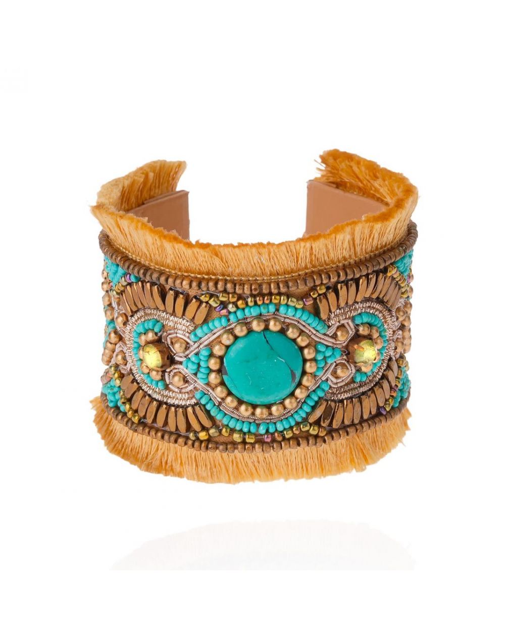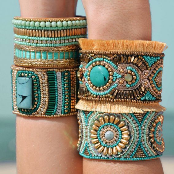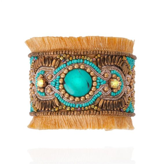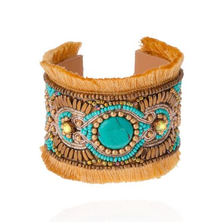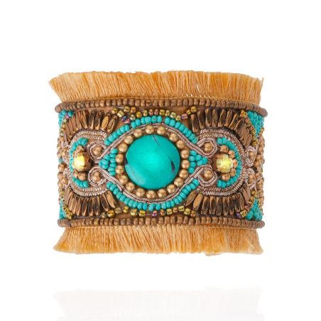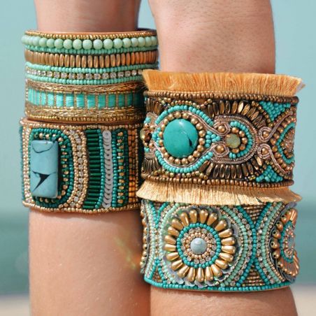 Plongez dans l’éclat azuré de Coral Coast avec le bracelet Jorgina. Véritable statement de style, il se pare de perles de rocaille mordorées et turquoise, sublimées par des strass sertis et de majestueux palets en turquoise recomposée. Une pièce exubérante et précieuse, inspirée des lagons et du soleil doré, parfaite pour illuminer vos looks estivaux.