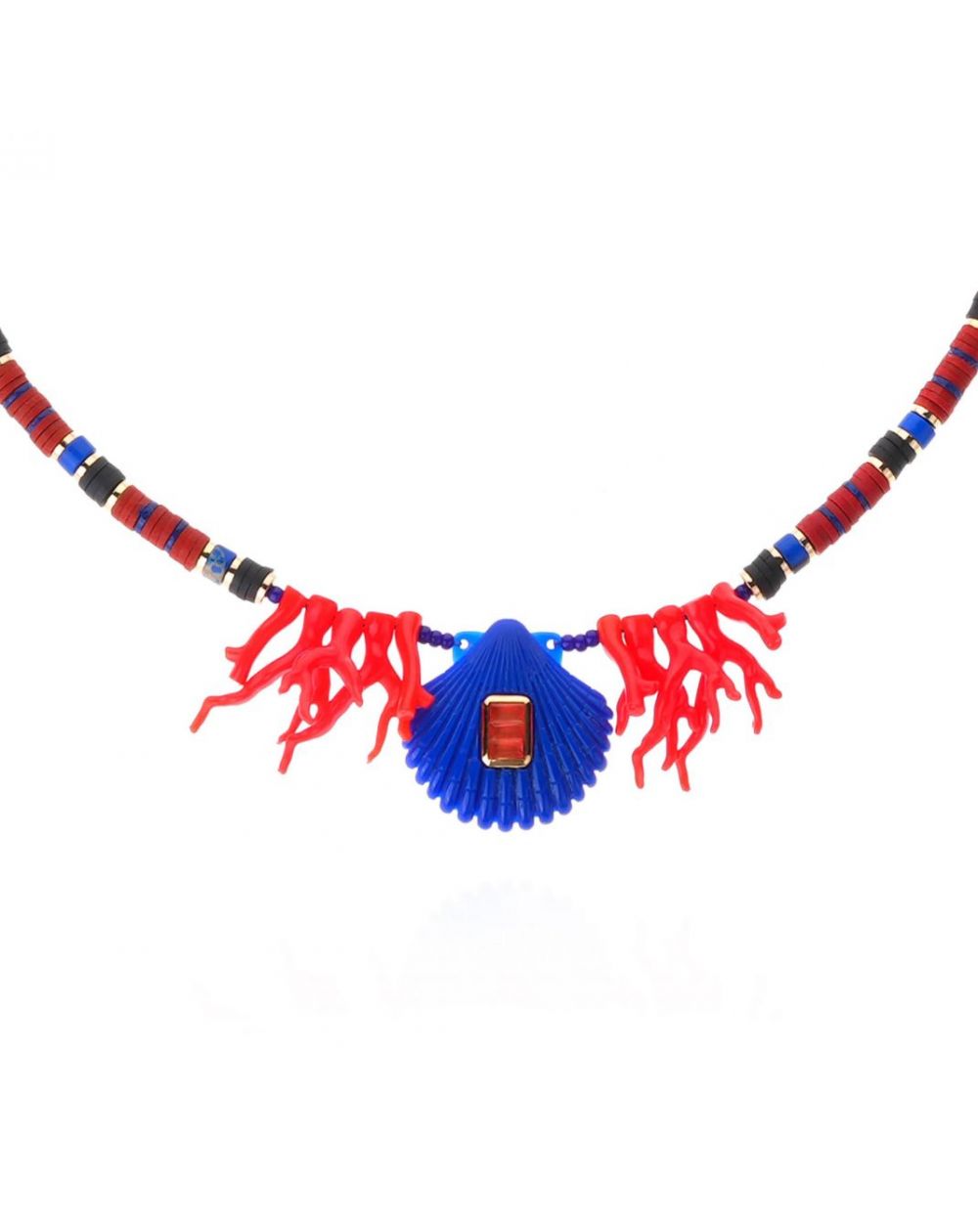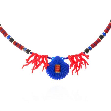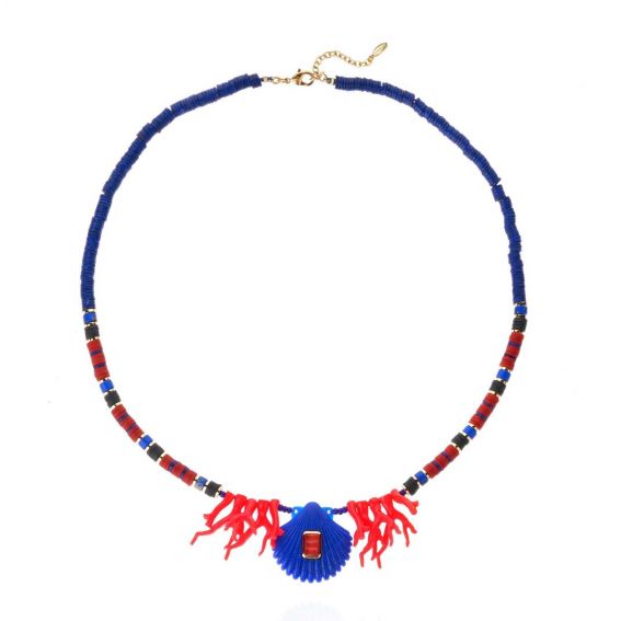 Plongez dans l’univers fascinant de Coral Coast avec le collier Dorie. Doré à l’or fin, il s’orne de perles Miyuki et de rondelles aux nuances noires, rouge profond, dorées et bleues. Son pendentif, une coque finement striée de bleu profond, est sublimé par un cabochon facetté rubis et encadré de délicates branches de corail rouge en résine. Disponible en deux coloris, il s’associe parfaitement au bracelet Shelley blanc pour un look harmonieux et solaire.