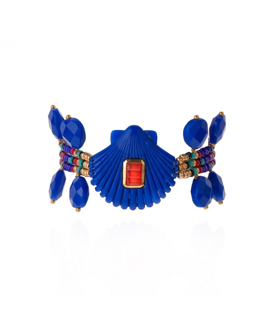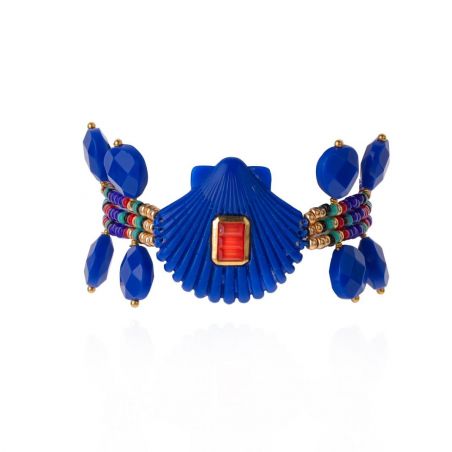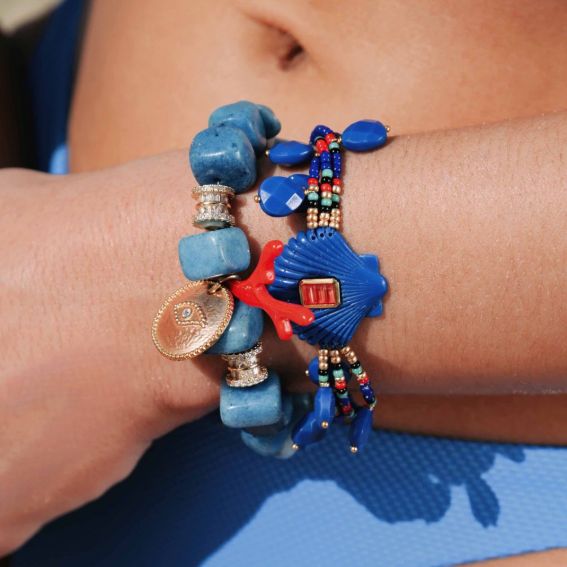 Plongez dans l’univers éclatant de Coral Coast avec le bracelet Shelley. Monté sur trois liens de perles Miyuki aux nuances bleues, turquoise, dorées, rouge corail et noires, il s’illumine d’une coque finement striée bleu grec, sublimée par un cabochon facetté aux reflets corail. De délicates gouttes bleues facettées encadrent l’ensemble, ajoutant une touche précieuse et unique. Disponible en deux coloris, il se porte seul ou en accumulation pour un look solaire et sophistiqué.