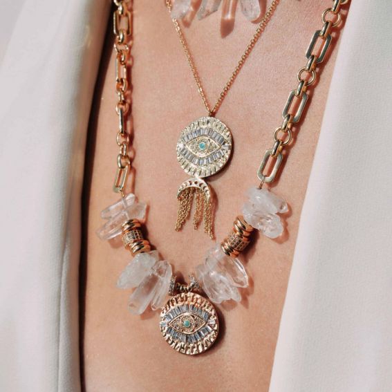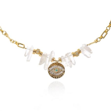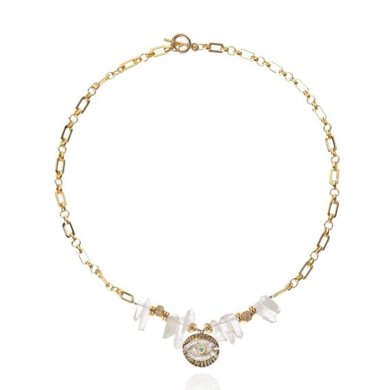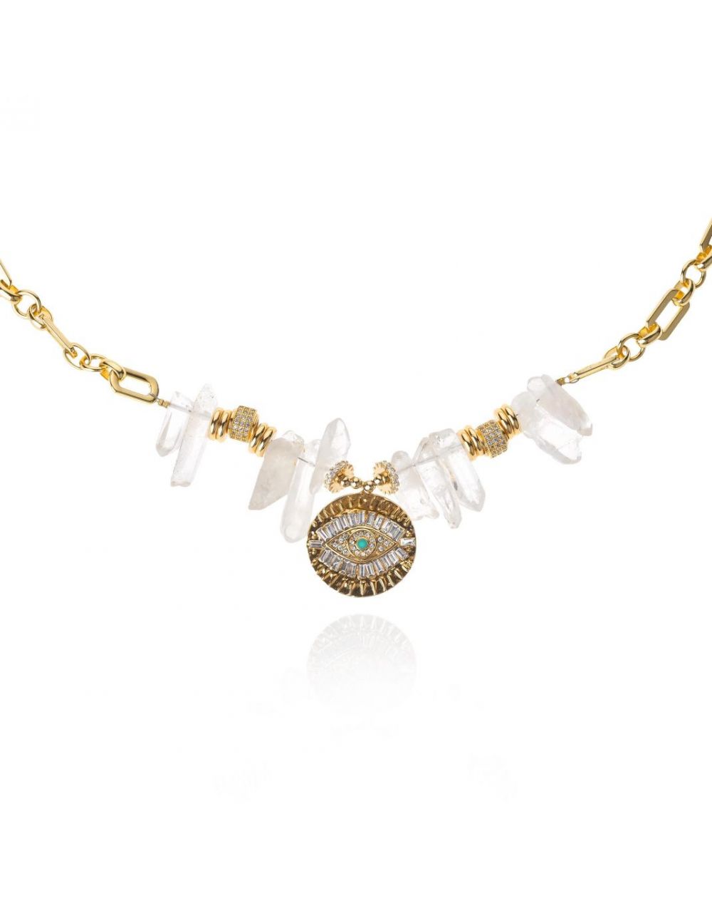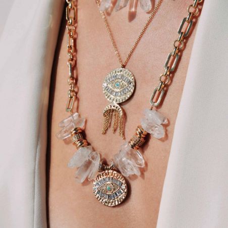 Avec ses volumes audacieux et ses reflets scintillants, le collier Ulysse capture l’essence solaire de Coral Coast. Doré à l’or fin et entièrement conçu à la main, il se distingue par de majestueuses pierres allongées et anguleuses, rappelant de grands cristaux, montées sur une chaîne gourmette. En son centre, un œil protecteur gravé sur une médaille martelée apporte une touche mystique et éclatante. Une pièce unique, à porter comme un talisman de lumière.