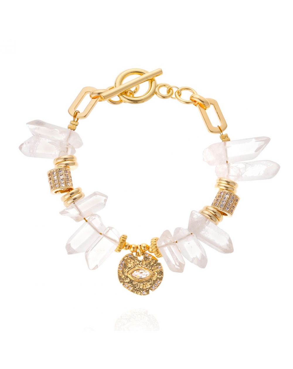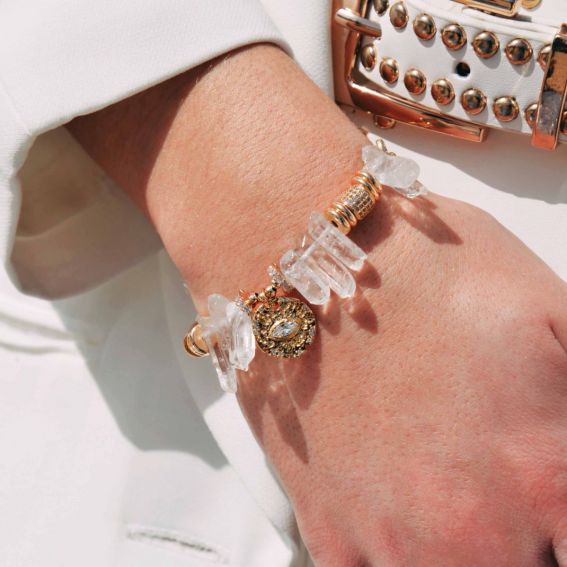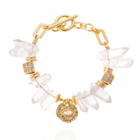 Avec ses volumes audacieux et ses reflets scintillants, le bracelet Hektor incarne l’âme solaire de Coral Coast. Doré à l’or fin et entièrement fait à la main, il alterne majestueusement pierres anguleuses façon cristaux et rondelles dorées strassées. En son centre, une médaille martelée dévoile un œil protecteur, symbole de lumière et de mystère. Associez-le au bracelet Georgio pour une allure estivale vibrante, inspirée des couleurs du littoral grec !